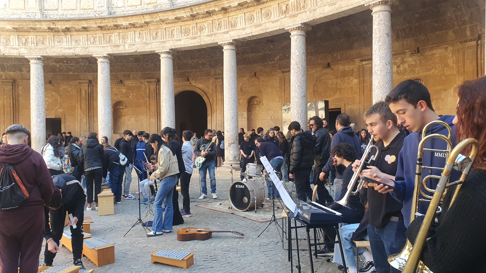 El alumnado del coro del IES Al-Ándalus ha participado hoy en la grabación del tema musical "Ven a Granada", del grupo Los Ángeles. Junto a chicos y chicas de otros institutos de la provincia, nuestro coro ha vivido la experiencia de cantar en el Palacio de Carlos V, bajo la mirada de turistas y los hijos de los músicos del extinto grupo granadino, a quien se pretende homenajear con esta actividad.