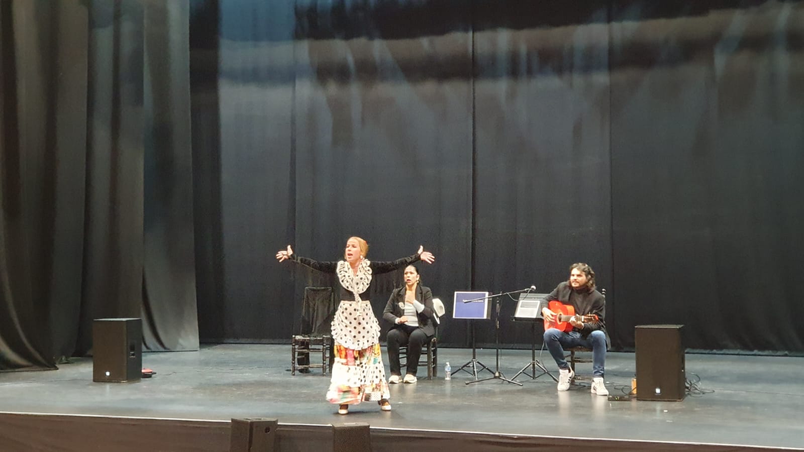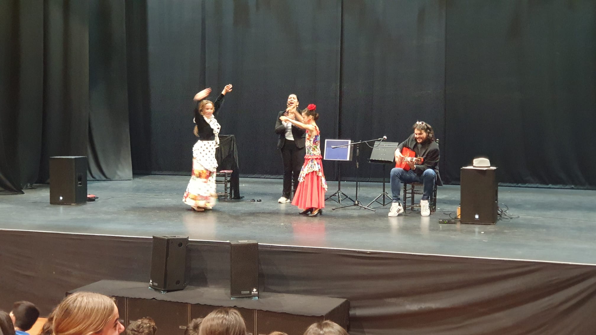 Entre las actividades realizadas con motivo del Día Internacional de Flamenco, el alumnado de 1º ESO, 2º ESO, Cultura Flamenca de 3º ESO y NEE han asistido a la charla-recital flamenco de María la Canastera y Niño Carmelo en el Auditorio Martín Recuerda de Almuñécar. María nos hizo disfrutar un año más con su cante y sus cercanas explicaciones sobre el flamenco. Este año María nos ha hablado de Lorca y su vínculo con el pueblo gitano y el flamenco. El alumnado, que había preparado con sus profesoras “La Tarara”, cantó la canción y la tocó con la flauta mientras Carmelo acompañaba con la guitarra. El alumnado, que tuvo un muy buen comportamiento, disfrutó de la actividad y demostró su atención al finalizar el recital, contestando correctamente a las preguntas que les hizo María. Un año más acabamos esta reseña animando a asistir a espectáculos flamencos y disfrutar de esta maravillosa música. ¡Qué viva el Flamenco!