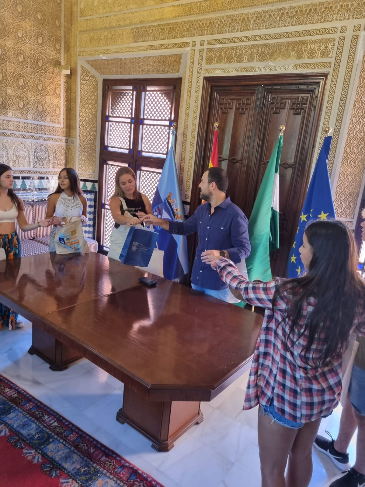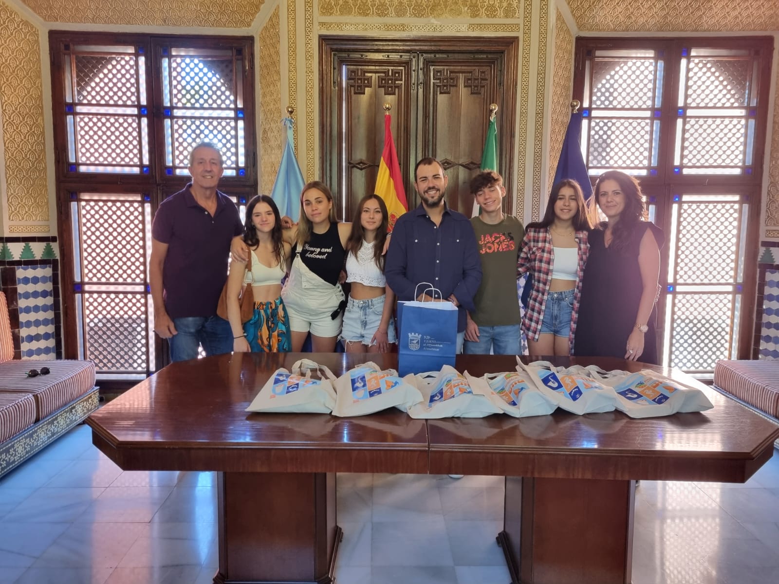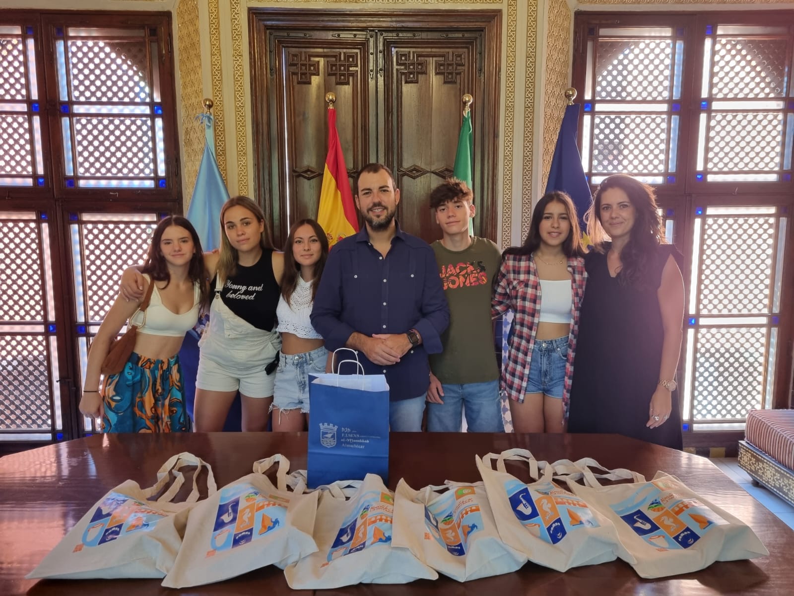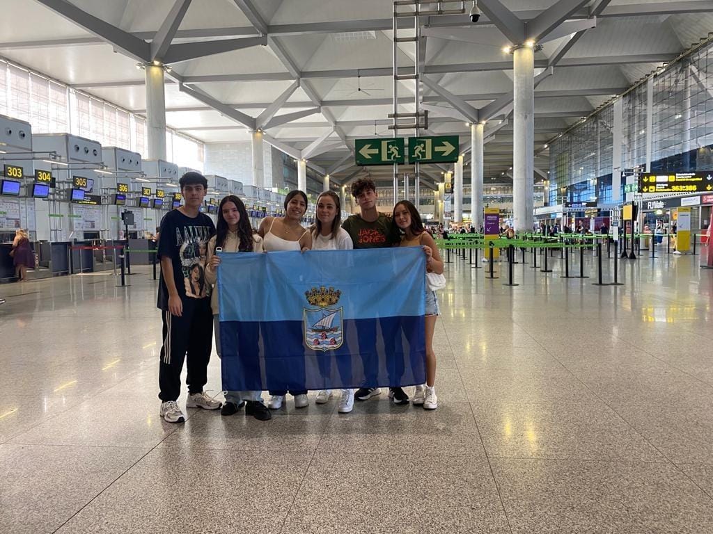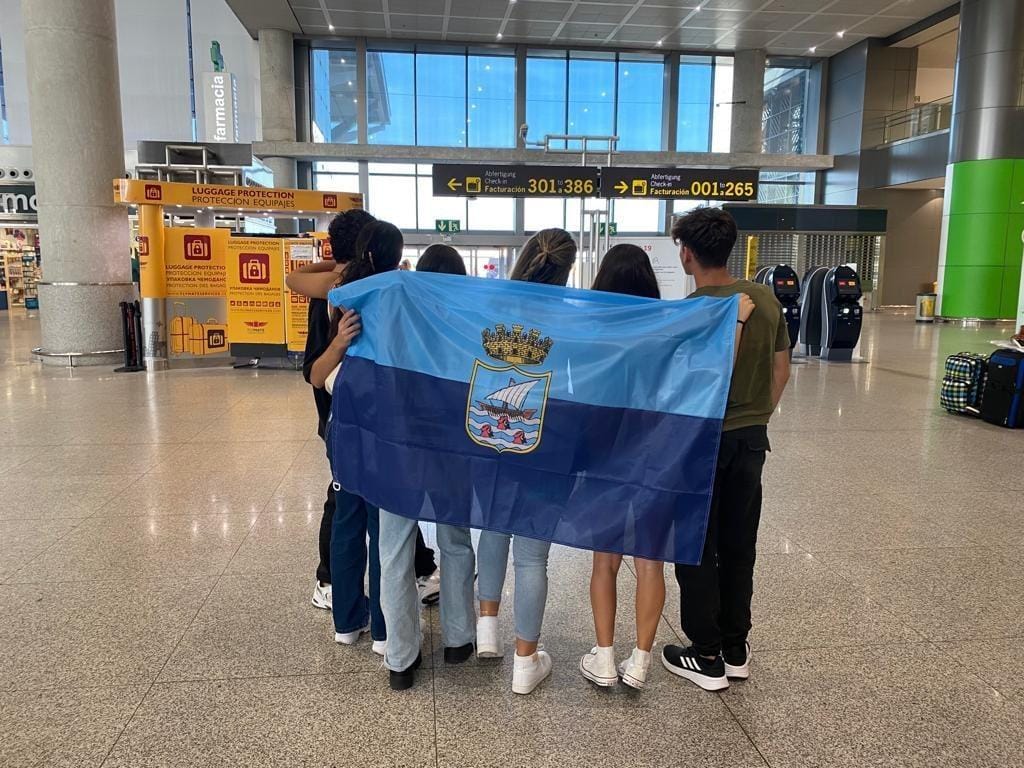 El concejal de Cultura, Fiestas y Educación de Almuñécar, Alberto García Gilabert, ha querido felicitar y despedir personalmente a los alumnos participantes en esta movilidad internacional, recibiéndolos en el Palacete de la Najarra, acompañados por sus profesores de idiomas. Allí les ha hecho entrega de unos obsequios de Almuñécar y de una bandera de la localidad para el viaje. A su llegada al aeropuerto ya tomaron su primera foto con los colores sexitanos. |