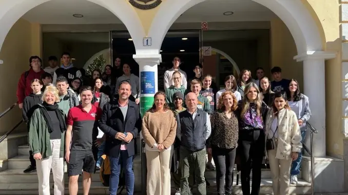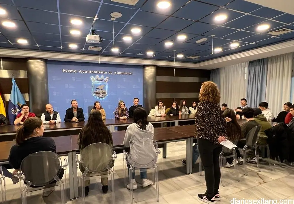 La teniente de alcalde del Ayuntamiento de Almuñécar, Beatriz González Orce y el concejal delegado de Cultura, Alberto García Gilabert han recibido este lunes en el Consistorio sexitano a los alumnos y profesores de dos institutos de Alemania y Grecia que participan en el intercambio Eramus+ con el IES Al Andalus de Almuñécar.