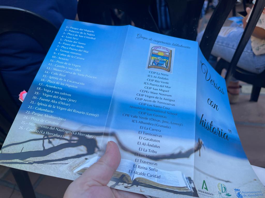 El pasado viernes tuvo lugar en el parque del Majuelo la presentación de proyecto “Versos con historia” realizado durante el presente curso por el grupo de cooperación bibliotecaria “Marea lectora”, integrado por todas las bibliotecas escolares de Almuñécar, Jete, Otívar, Lentegí y La Herradura.