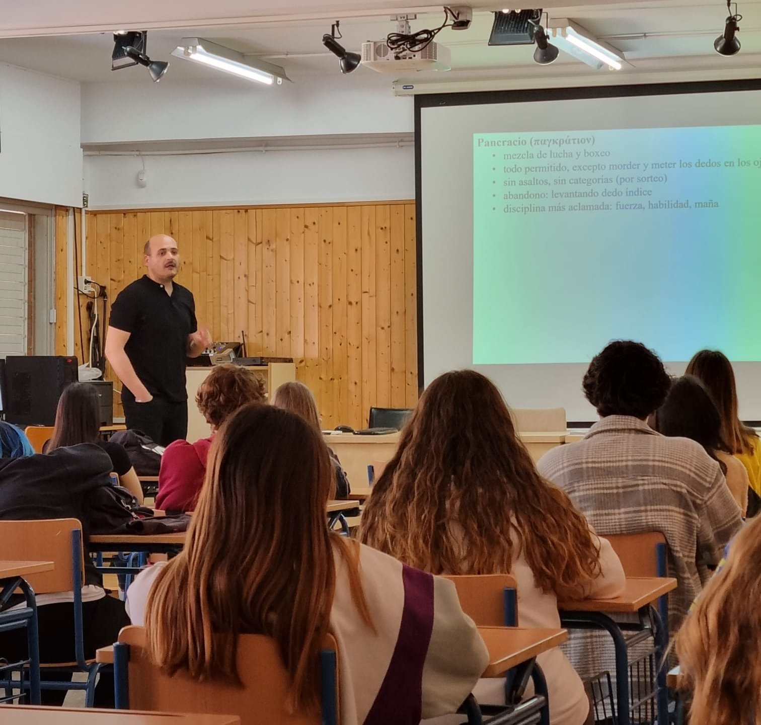Bajo el título "EDUCACIÓN FÍSICA VS DEPORTE PROFESIONAL EN LA ANTIGUA GRECIA", el profesor del Departamento de Filología Griega de la Universidad de Granada, ÁLVARO IBÁÑEZ CHACÓN, ha impartido esta conferencia y ha entusiasmado tanto al alumnado como a los profesores que han asistido a la misma con su forma sencilla y magistral de explicar. Ha sido un placer oír a viva voz y además contar con la presencia de este magnífico profesor en el I.E.S Al Ándalus.