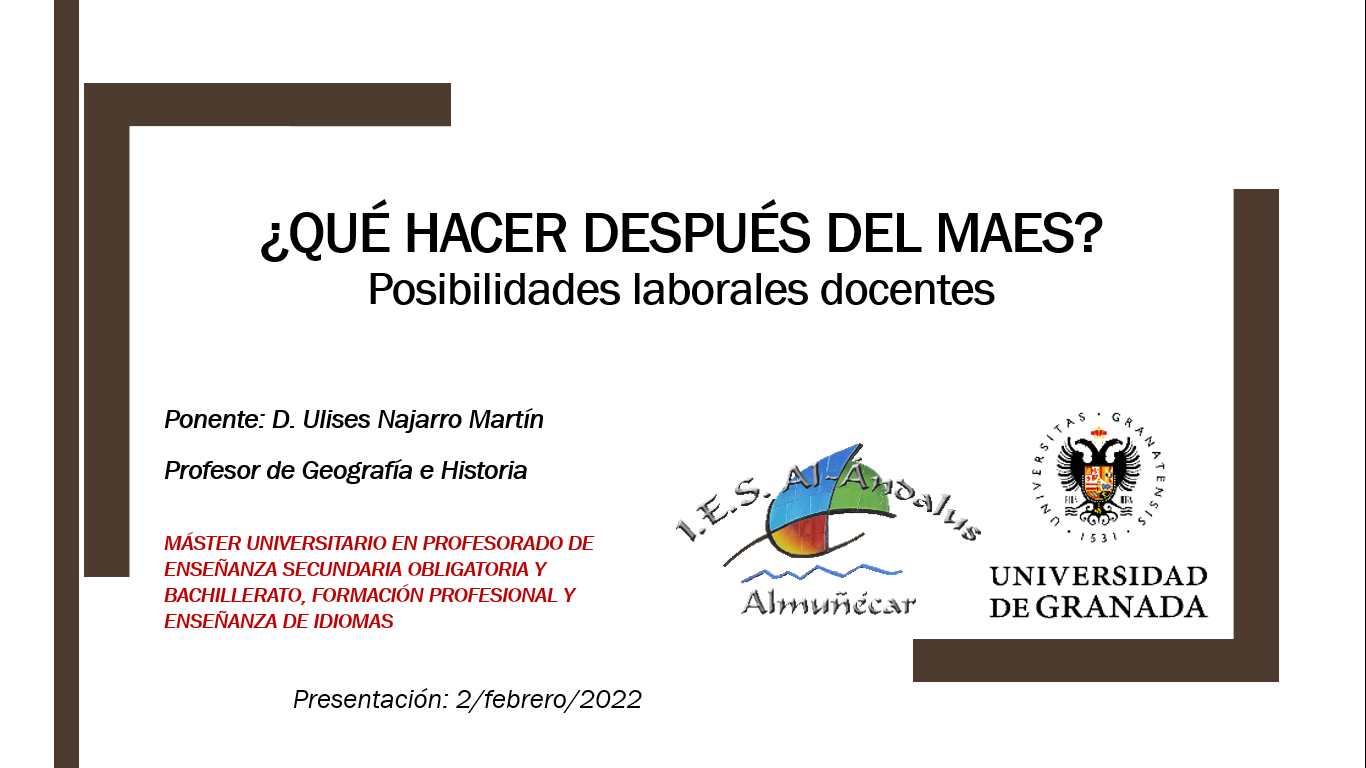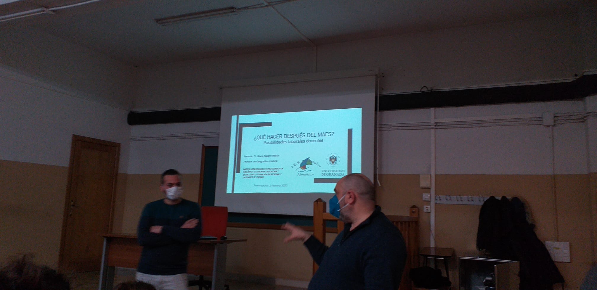 En la tarde de ayer el profesor de Geografía e Historia D. Ulises Najarro Martín, del I.E.S. Al-Ándalus, impartió una ponencia titulada “¿Qué hacer después del MAES? Posibilidades laborales docentes” dirigida al alumnado del Máster de Profesorado en Enseñanza Secundaria y Bachillerato de la Universidad de Granada.