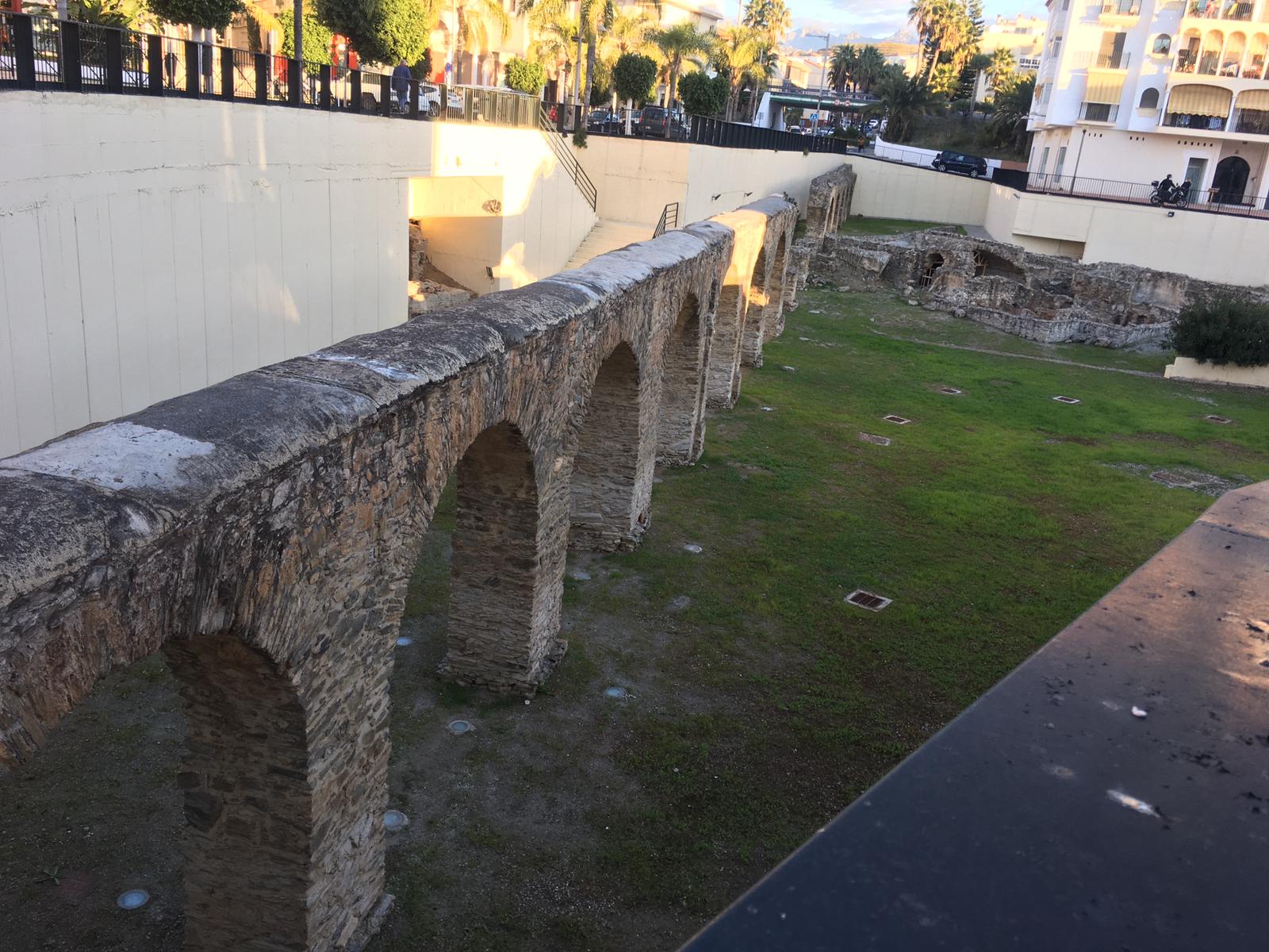 Este martes el alumnado de Latín de 4º de la ESO salió a visitar el acueducto y las termas romanas del s. I d.C. que hacen más bella la ciudad de Almuñécar. Estuvimos contemplando lo que un día fueron sus seis piscinas y debatiendo sobre el interesante lugar de encuentro social que debieron de ser aquellos baños públicos. Además, tratamos de imaginar cómo sería aquel acueducto que traía las aguas desde Jete hasta nuestra costa.