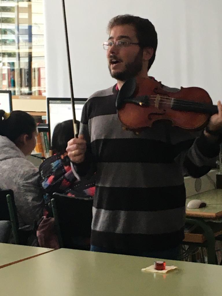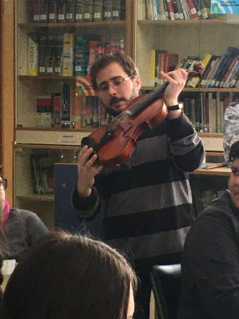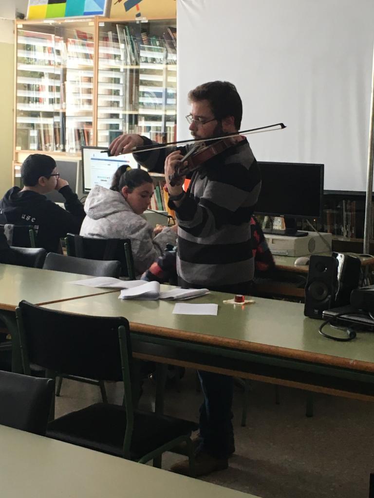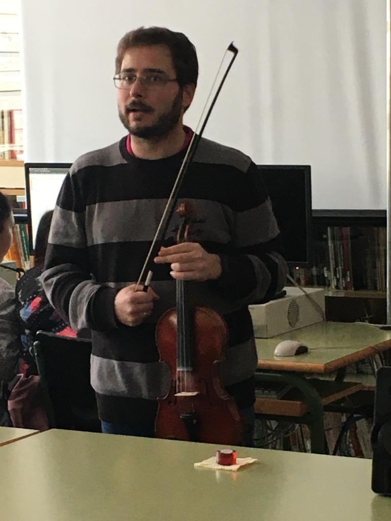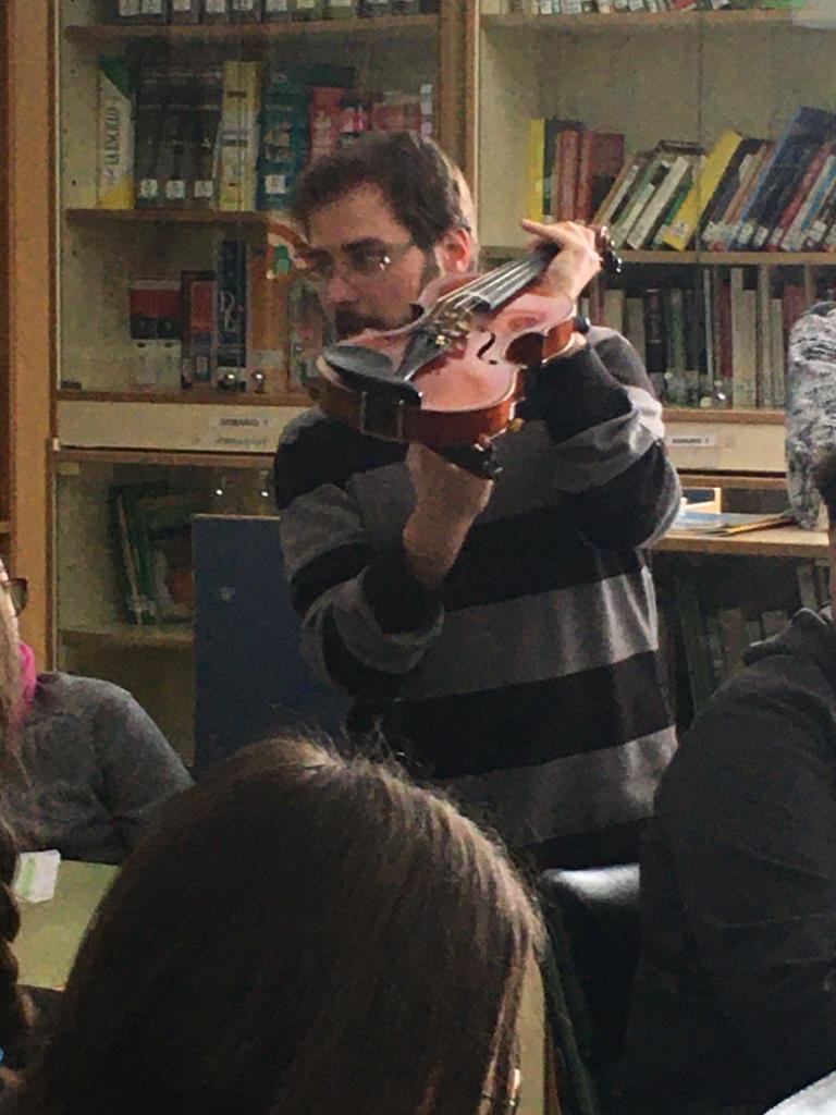 La segunda charla de esta semana ha sido la de Gabino Marín, profesor de Física y Química, que ha dejado un momento las tareas de laboratorio para introducirnos en el maravilloso mundo del violín. Gabino nos ha mostrado todos los secretos que esconde el violín por dentro y por fuera para que nos familiaricemos con este precioso instrumento antes de ofrecernos un divertidísimo mini concierto de violín en el que no hemos echado nada en falta: desde la música clásica hasta el rock, música celta, música de cine, de series, incluso La bamba... ¡ha sido genial! Muchas gracias, Gabino, por llevar las notas del violín a la biblioteca.