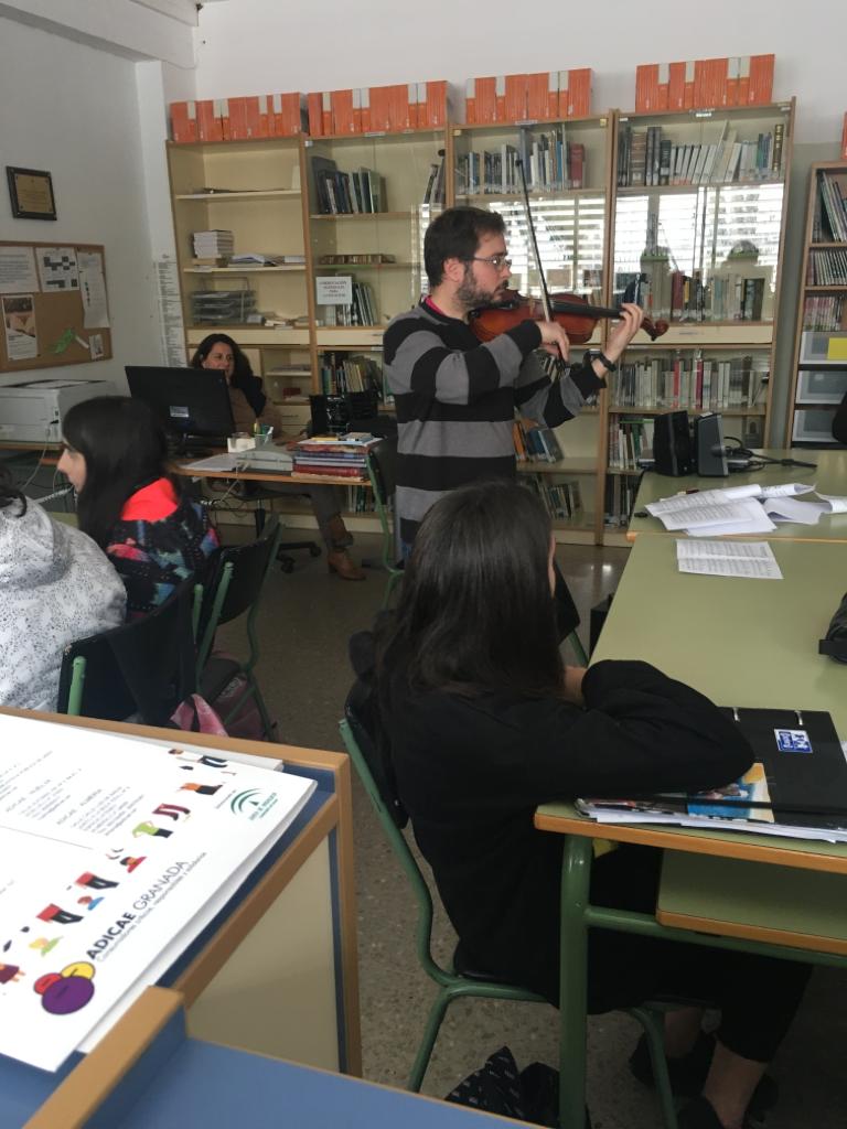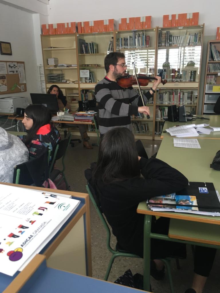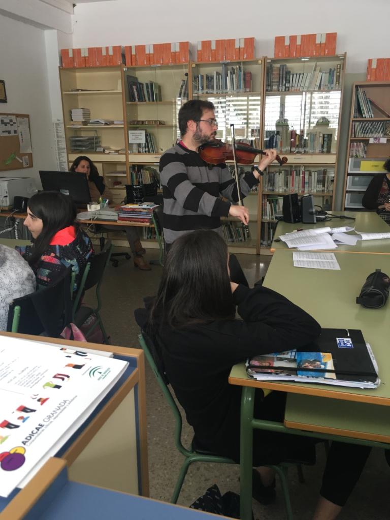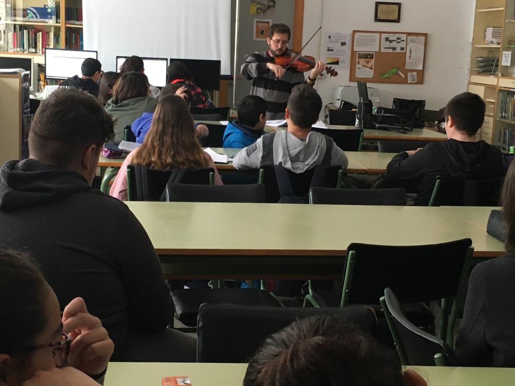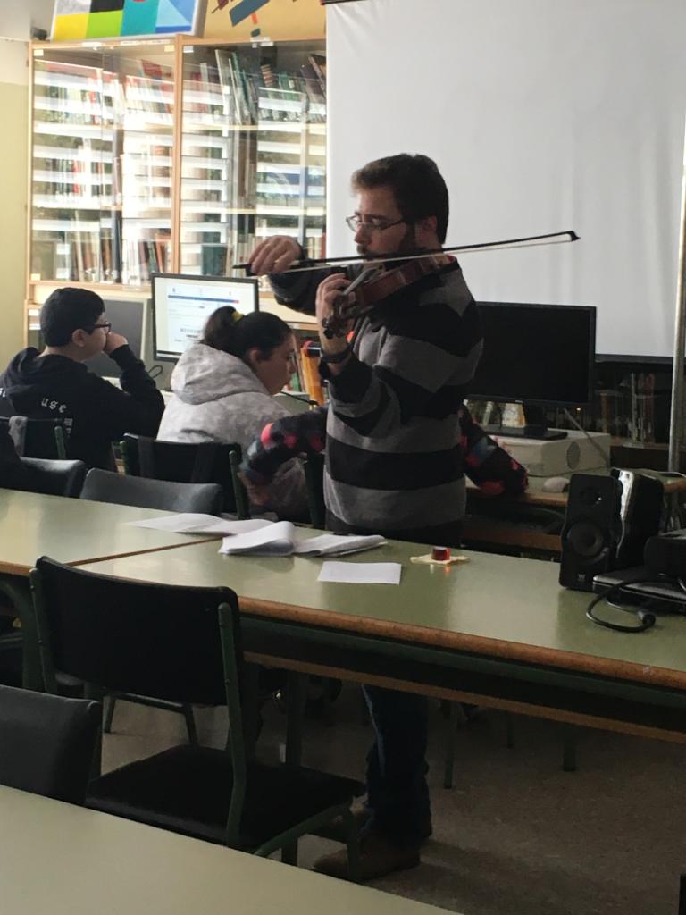 La segunda charla de esta semana ha sido la de Gabino Marín, profesor de Física y Química, que ha dejado un momento las tareas de laboratorio para introducirnos en el maravilloso mundo del violín. Gabino nos ha mostrado todos los secretos que esconde el violín por dentro y por fuera para que nos familiaricemos con este precioso instrumento antes de ofrecernos un divertidísimo mini concierto de violín en el que no hemos echado nada en falta: desde la música clásica hasta el rock, música celta, música de cine, de series, incluso La bamba... ¡ha sido genial! Muchas gracias, Gabino, por llevar las notas del violín a la biblioteca.