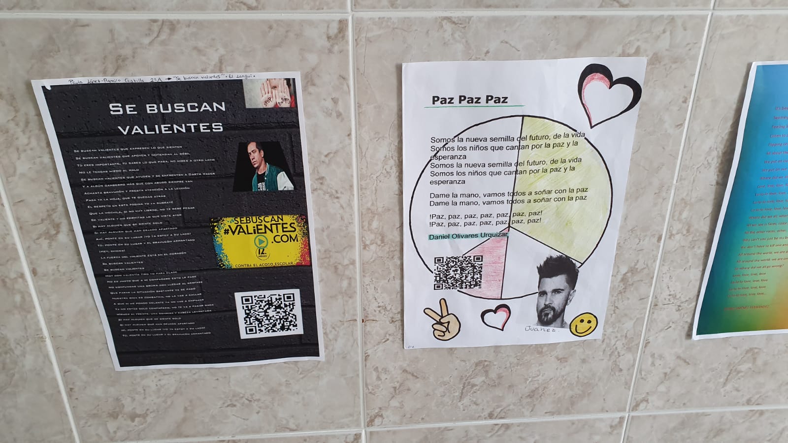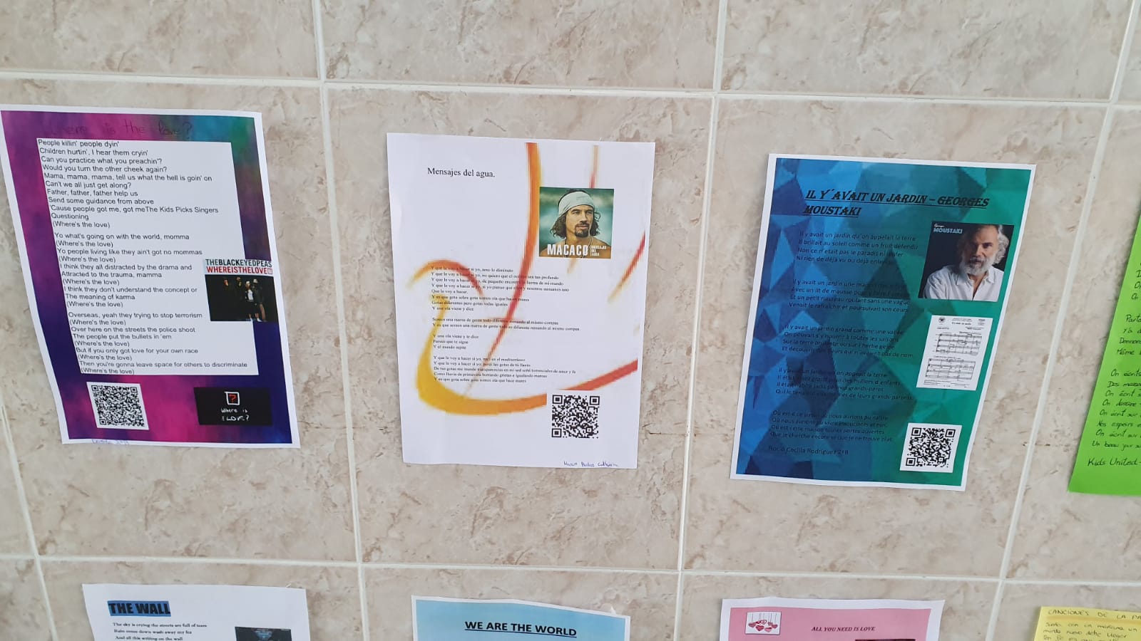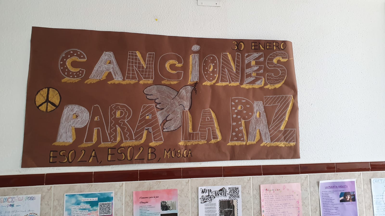 Otra de las actividades organizadas por el departamento de música, relacionadas con el Día de la Paz y la no Violencia Escolar, ha sido la exposición de canciones con temática sobre la paz que han realizado los alumnos de ESO2A, ESO2B y NEE. El alumnado ha investigado canciones relacionadas con este tema, han escrito la letra y han pegado un código QR con el que enlazar al video de la canción. Esperamos que el trabajo haya servido para reflexionar sobre la importancia de relacionarse de forma sana y cordial con nuestro entorno, amigos, hermanos, padres, profesores…