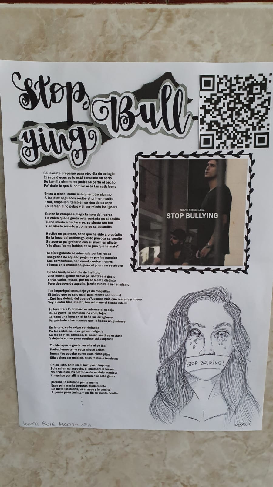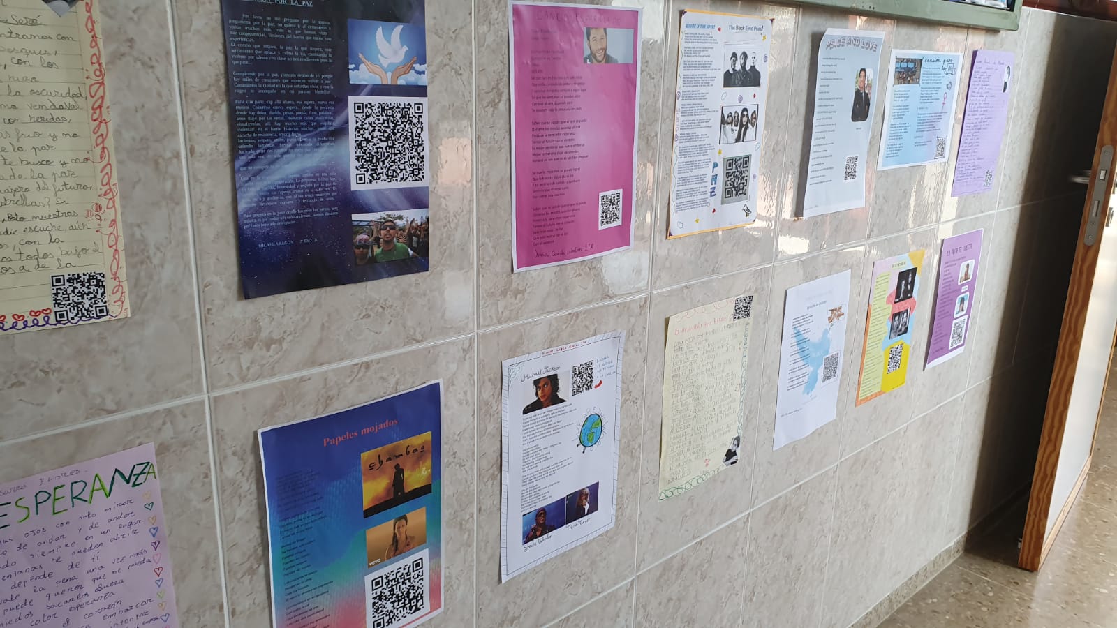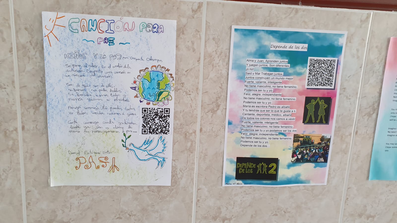 Otra de las actividades organizadas por el departamento de música, relacionadas con el Día de la Paz y la no Violencia Escolar, ha sido la exposición de canciones con temática sobre la paz que han realizado los alumnos de ESO2A, ESO2B y NEE. El alumnado ha investigado canciones relacionadas con este tema, han escrito la letra y han pegado un código QR con el que enlazar al video de la canción. Esperamos que el trabajo haya servido para reflexionar sobre la importancia de relacionarse de forma sana y cordial con nuestro entorno, amigos, hermanos, padres, profesores…