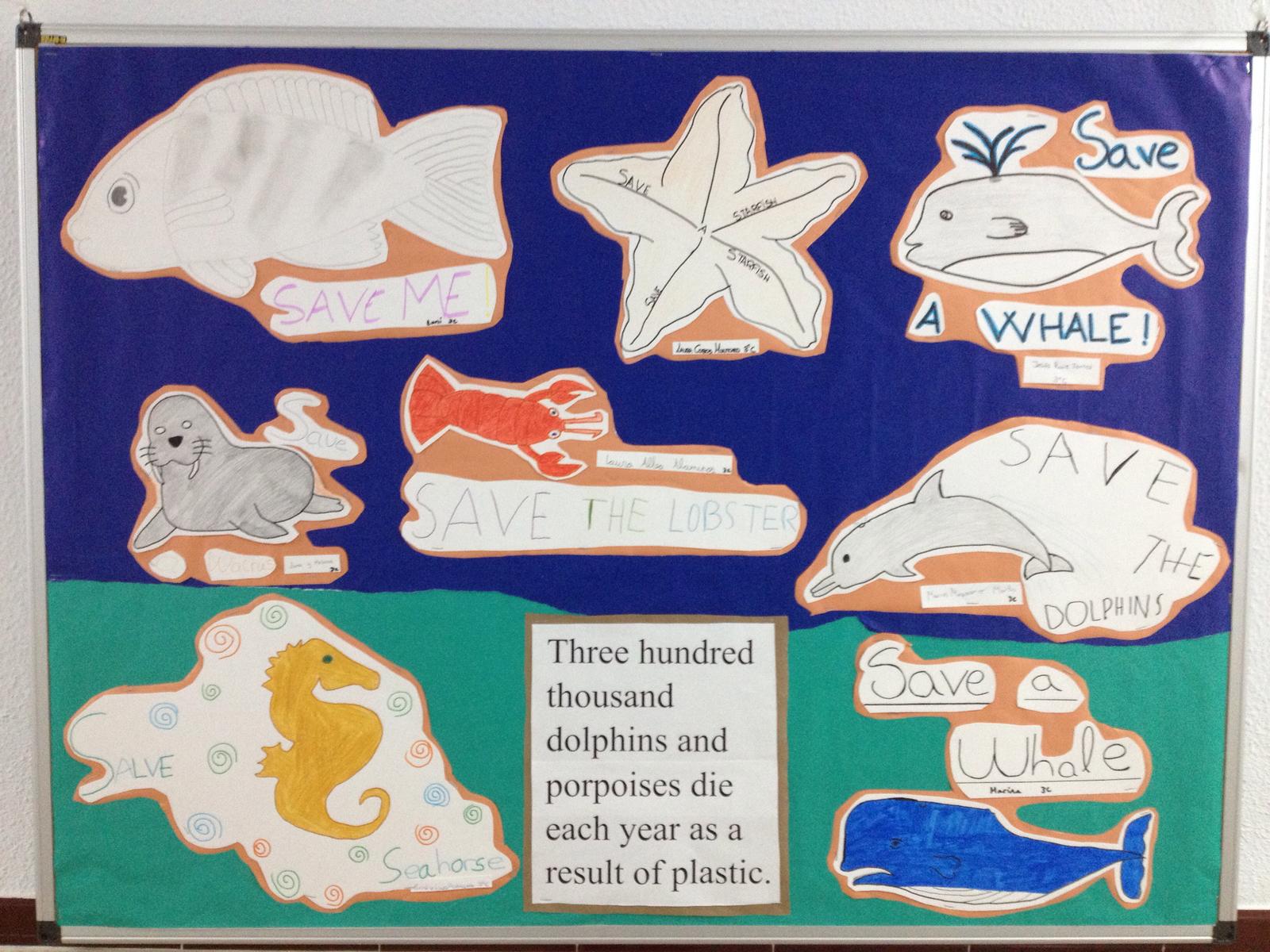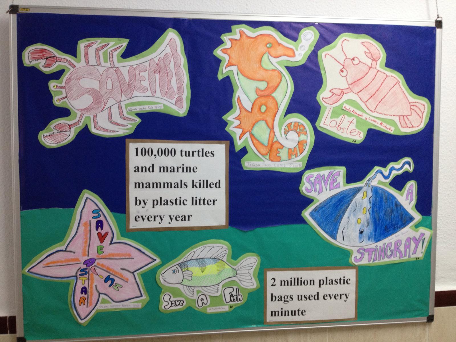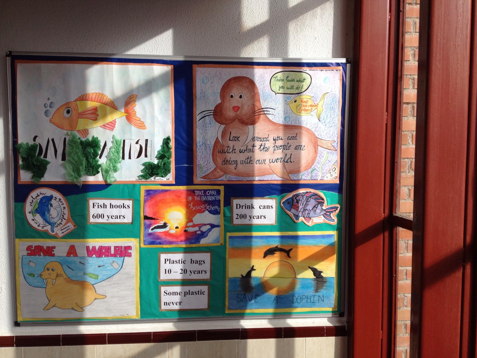 The students made a few posters on the issue of saving the environment. These posters have been placed throughout the school hallways, for everyone to view. Action towards saving the environment can start anywhere. For example making others aware on the issue through posters is the first step towards saving our environment. The students can walk through the hallways with a sense of pride, knowing that they have done a small part with helping clean our world. From this project we have observed a sense of some ot the students talents through their individual artwork. They haven't only drawn some fish. They have also learnt and sung a song called “There is a Plastic Bag Floating in the Ocean” which they have enjoyed singing.