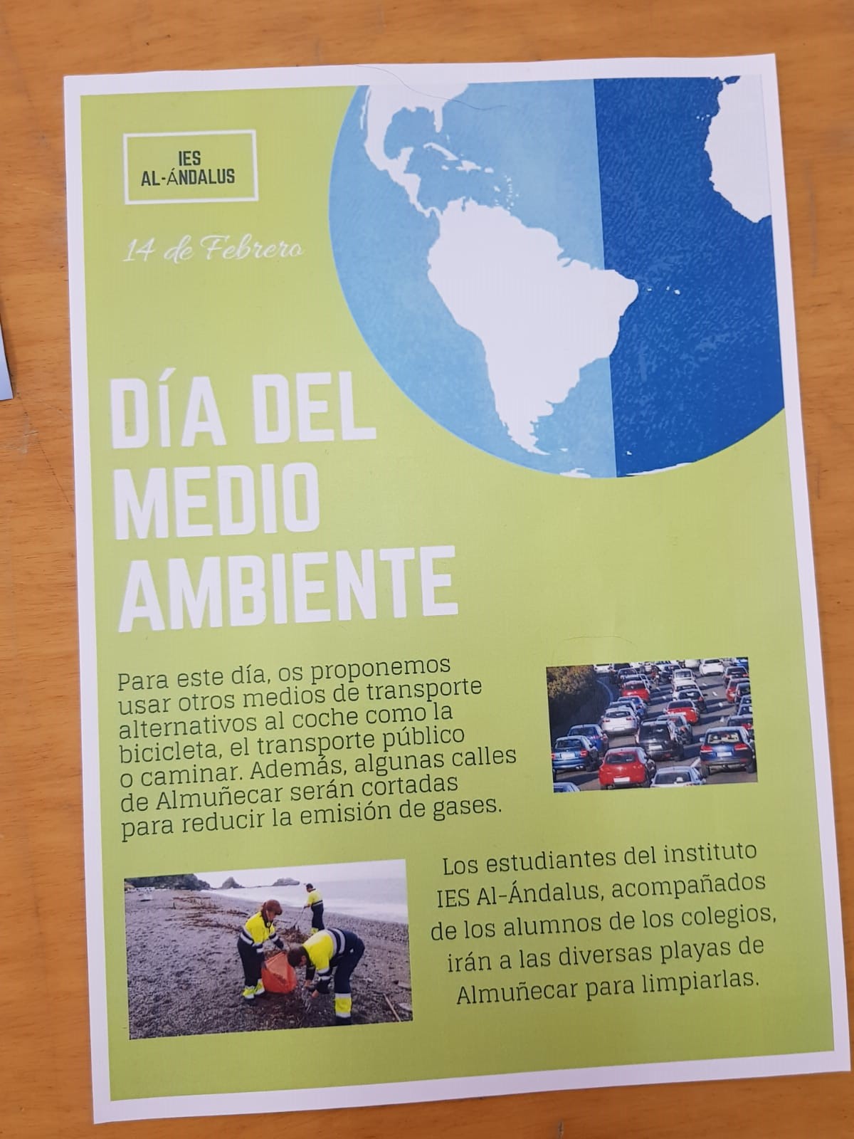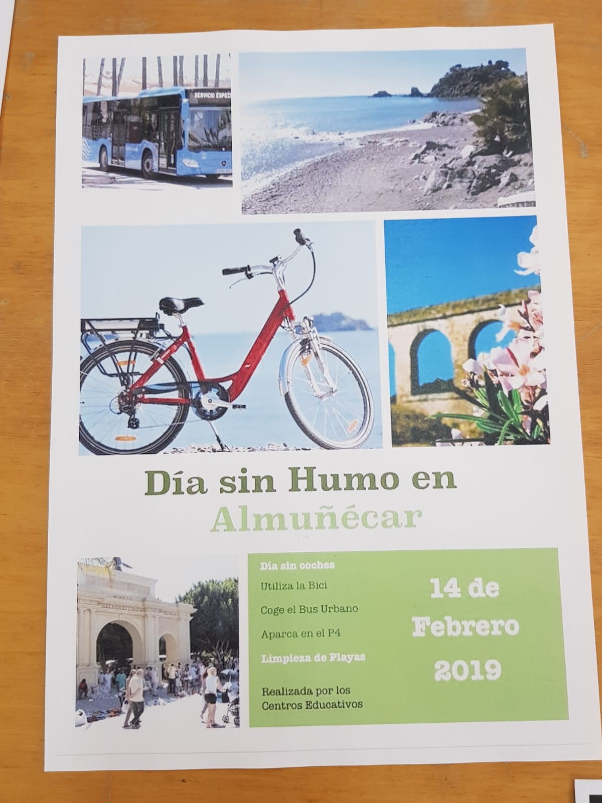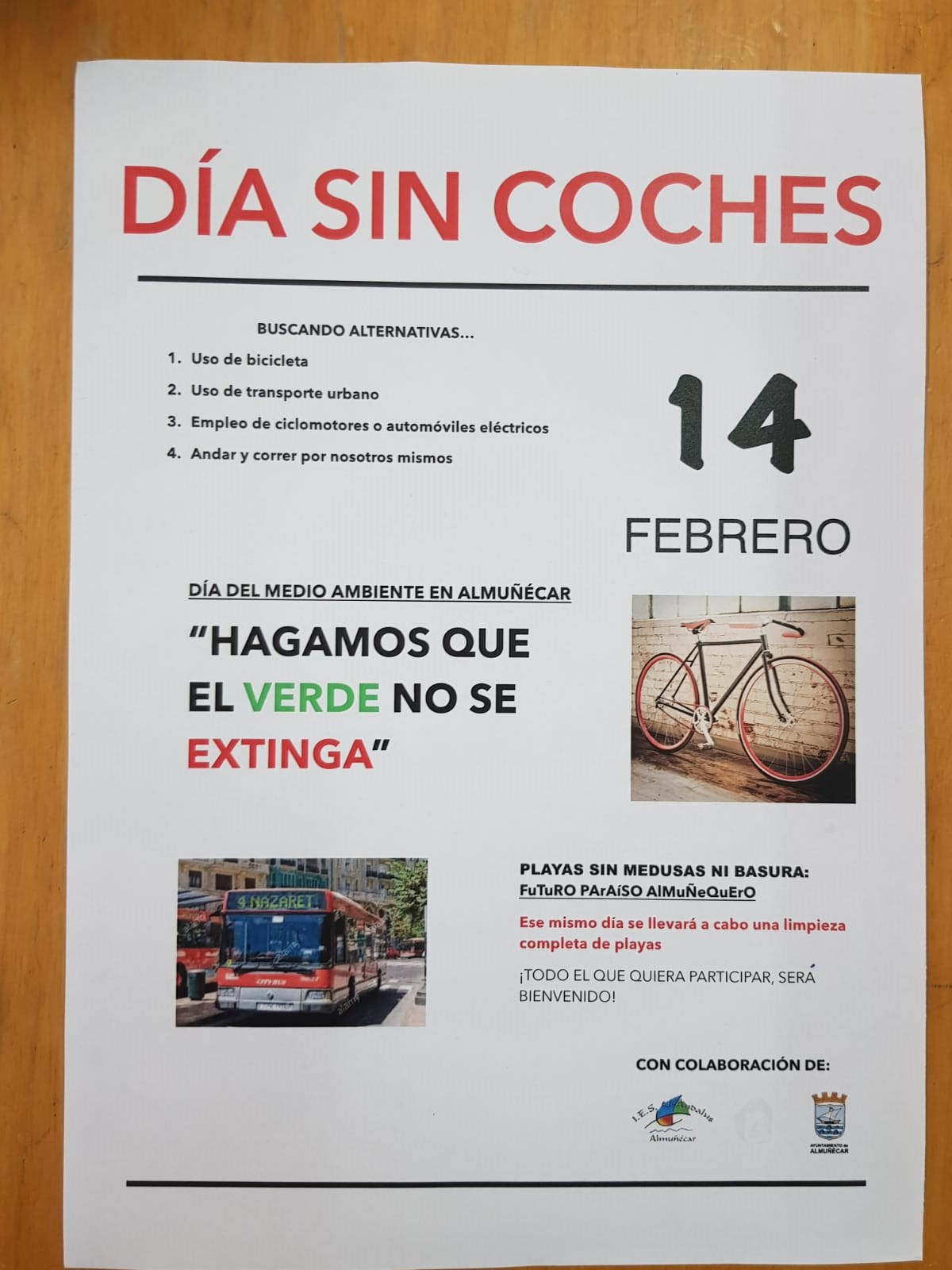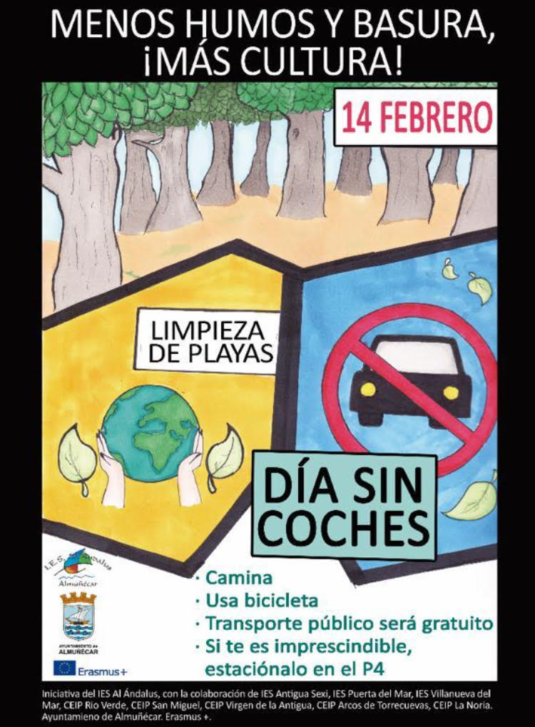 Iniciativa del IES Al-Ándalus con la colaboración de IES Antigua Sexi, IES Puerta del Mar, IES Villanueva del Mar, CEIP Rio Verde,CEIP San Miguel, CEIP Virgen de la Antigua, CEIP Arcos de Torrecuevas, CEIP La Noria, Ayuntamiento de Almuñécar y Erasmus+ pone en marcha el DÍA SIN COCHES el próximo 14 de Febrero bajo el lema MENOS HUMOS Y BASURA, ¡MÁS CULTURA para impulsar el cuidado del medio ambiente mediante actividades de limpieza de playas, uso de bicicleta, transporte público gratuito y si te es imprescindible el coche podrás estacionarlo en el P4.