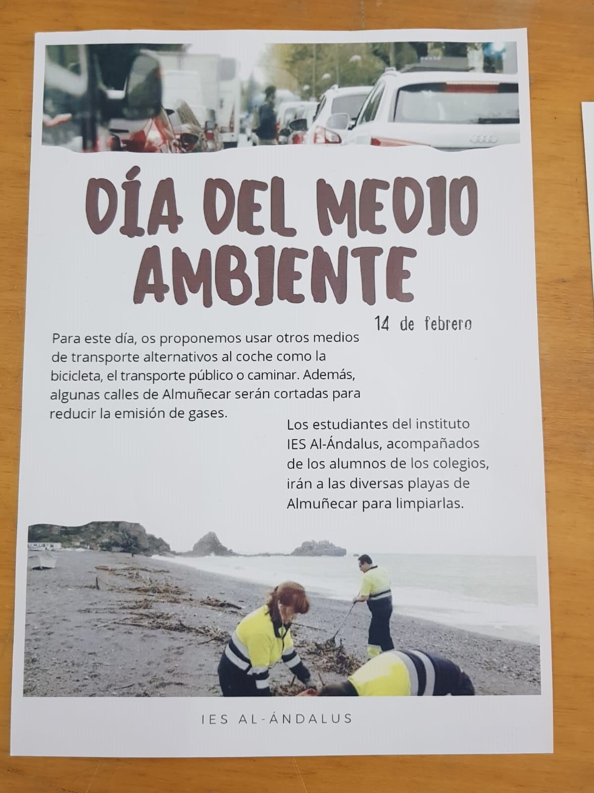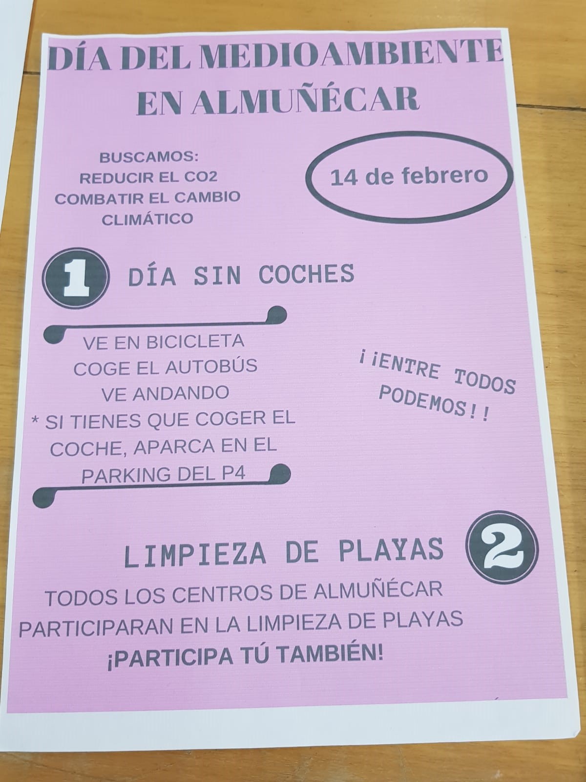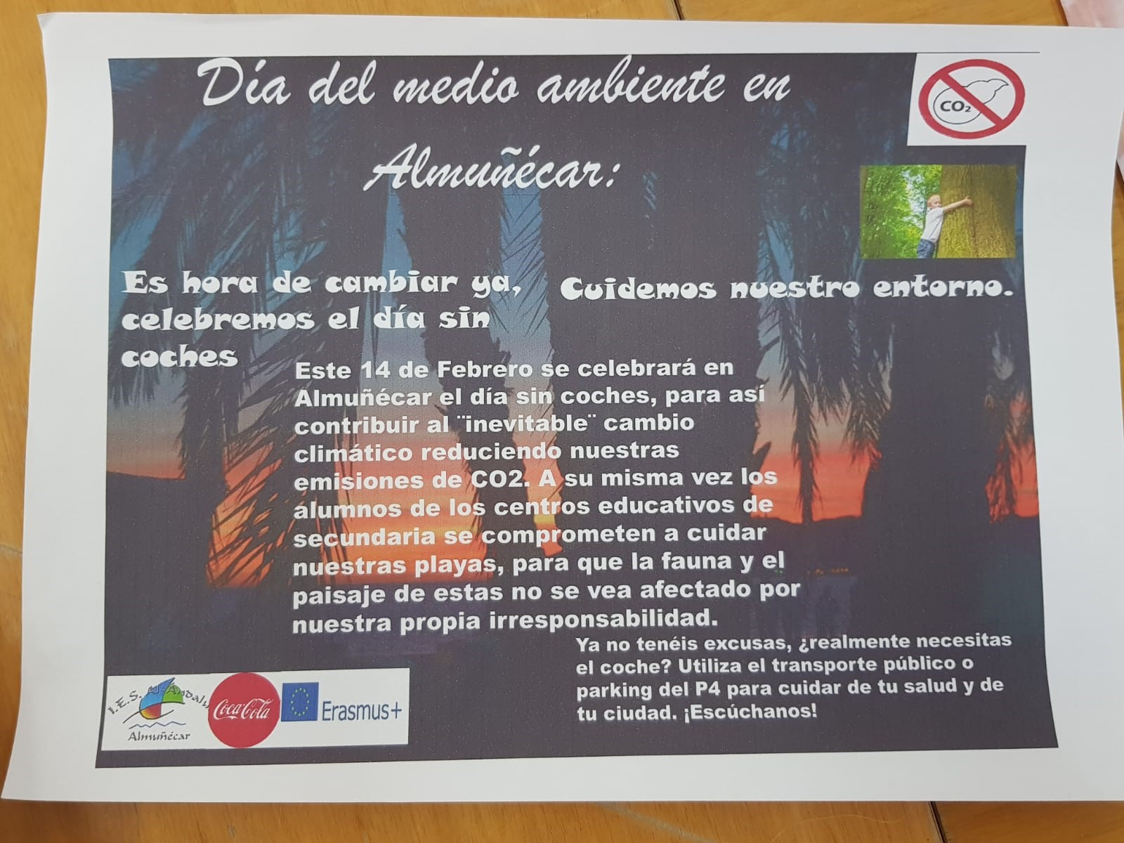 Iniciativa del IES Al-Ándalus con la colaboración de IES Antigua Sexi, IES Puerta del Mar, IES Villanueva del Mar, CEIP Rio Verde,CEIP San Miguel, CEIP Virgen de la Antigua, CEIP Arcos de Torrecuevas, CEIP La Noria, Ayuntamiento de Almuñécar y Erasmus+ pone en marcha el DÍA SIN COCHES el próximo 14 de Febrero bajo el lema MENOS HUMOS Y BASURA, ¡MÁS CULTURA para impulsar el cuidado del medio ambiente mediante actividades de limpieza de playas, uso de bicicleta, transporte público gratuito y si te es imprescindible el coche podrás estacionarlo en el P4.