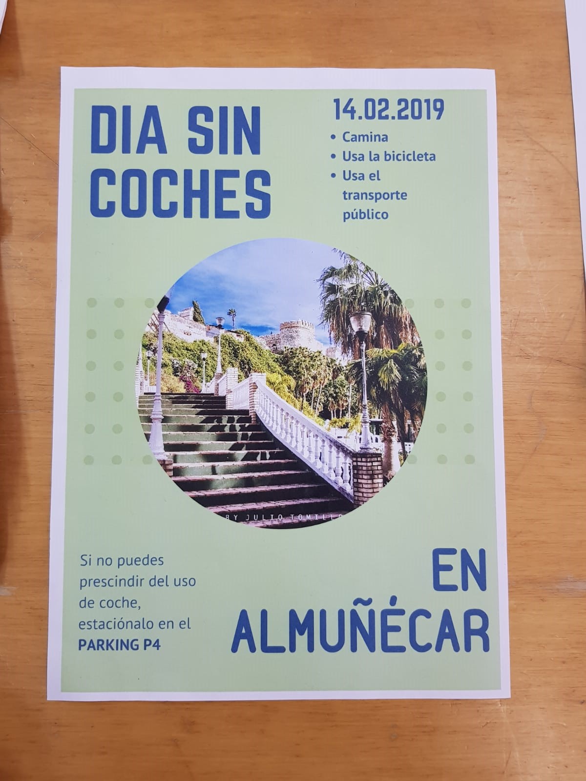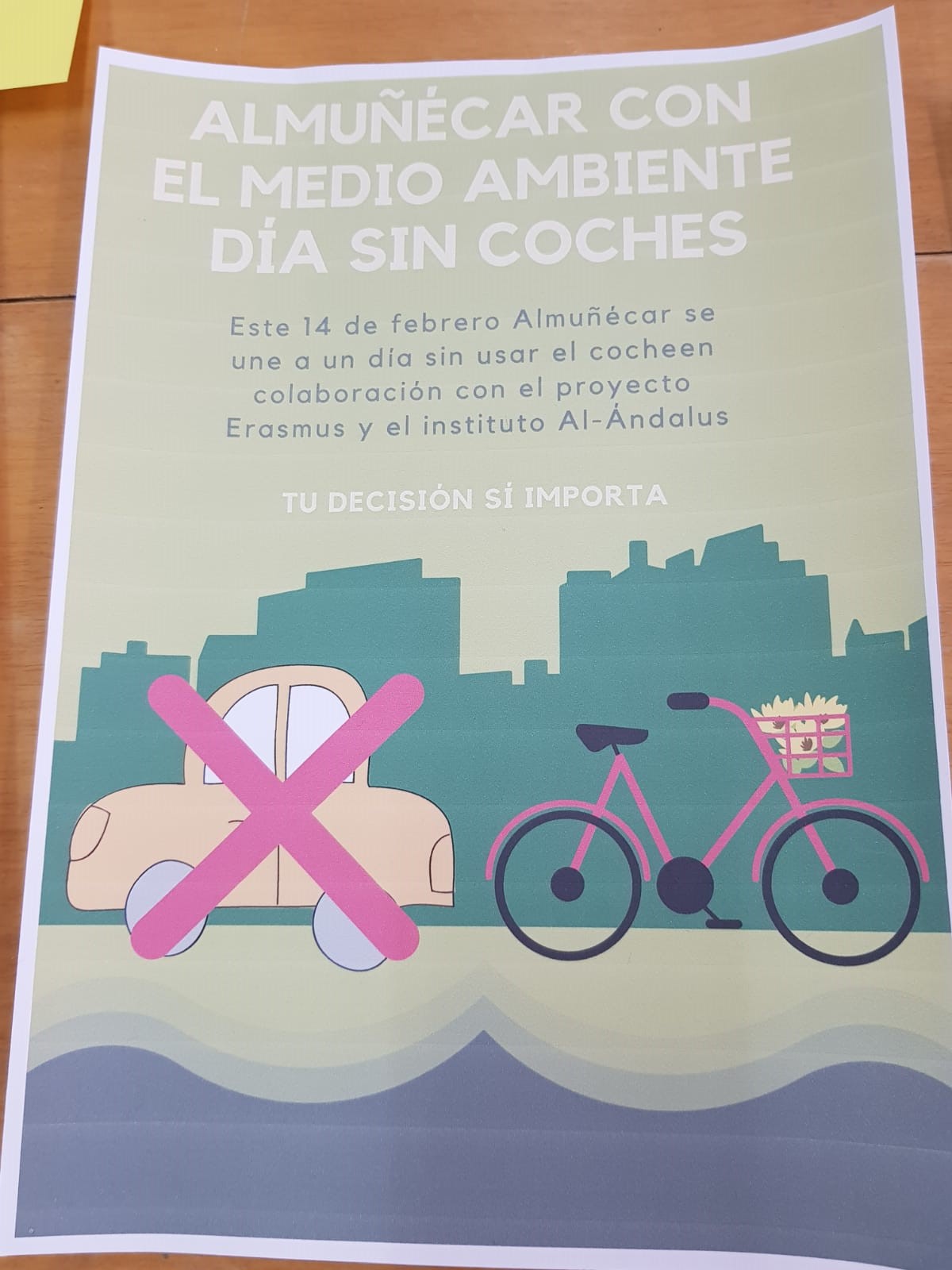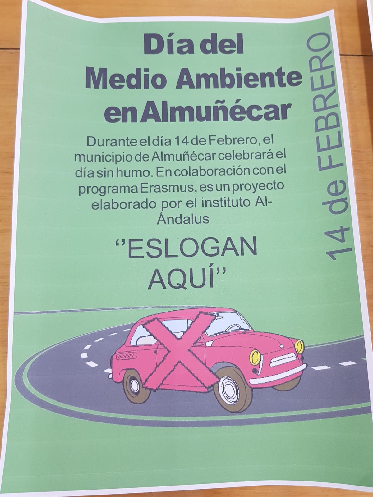 El IES Al-Ándalus dentro del programa Erasmus+ y en colaboración con el Ayuntantamiento de Almuñécar, ha impulsado la iniciativa del Día sin Coches, en el que el próximo 14 de Febrero se cortarán las calles del centro de Almuñécar y el transporte público será gratuito para apoyar dicha iniciativa. El Centro ha organizado un Concurso para escoger la portada y eslogan para el póster publicitario de ese día, siendo éstas las candidaturas de nuestro alumnado: