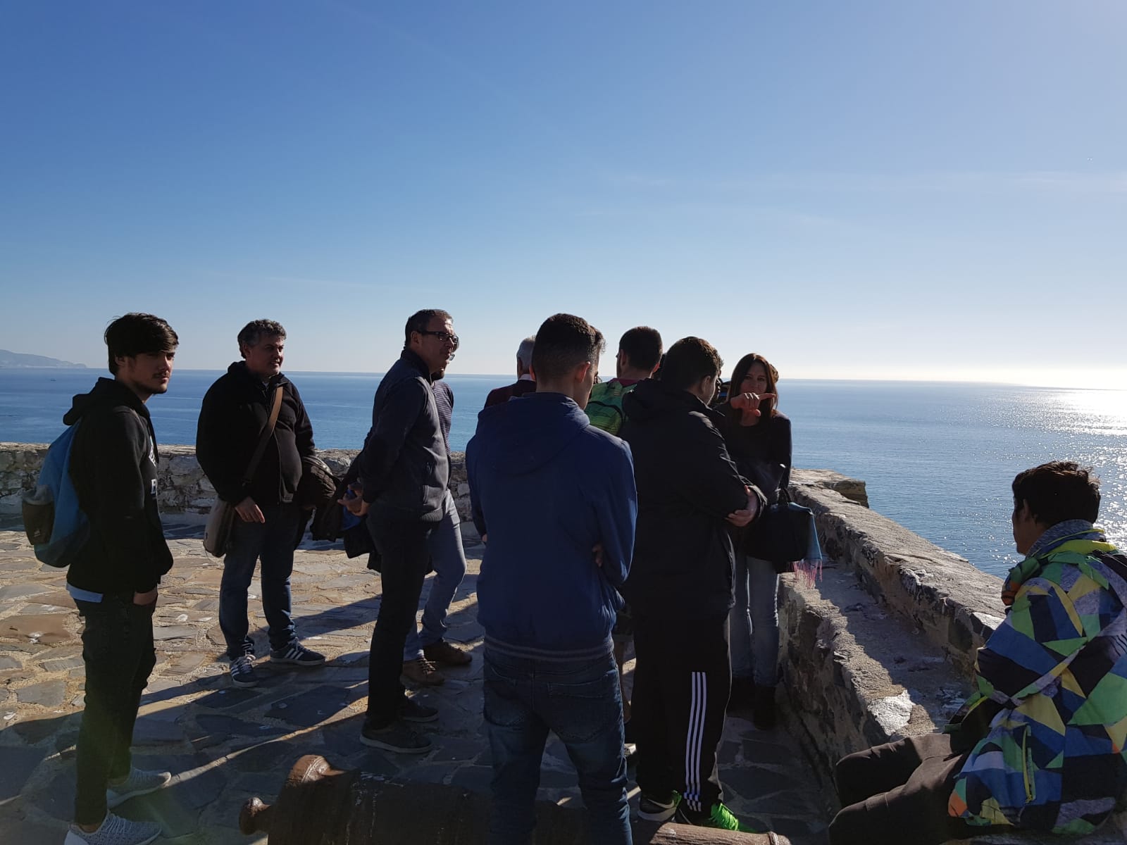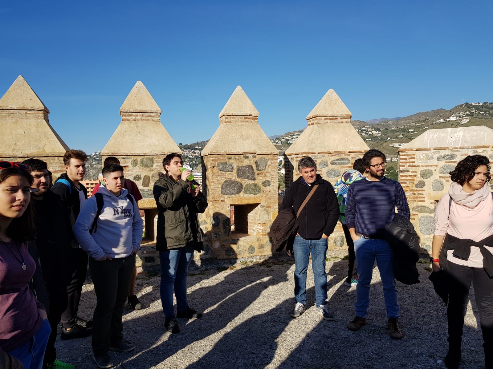 El pasado 21 de Diciembre,el profesor D.Antonio Portillo Baco organizó para el alumnado de FP de Electricidad y para el de Informática una visita al Castillo de San Miguel de nuestra localidad, acompañados por los profesores Emilio Hernández , Antonio José García, Sergio Naranjo y Manuel González y guiados por la arqueóloga municipal de Almuñécar, Dña.Elena Navas Guerrero, que explicó de forma amena y didáctica parte de los entresijos históricos de este castillo enclavado en la roca a pie de costa. Allí pudimos distinguir la parte musulmana de muros de tapial de la parte cristina de piedra, observar su torre derruida, los emplazamientos donde se hallaban sus termas,cisternas o letrinas. Elena nos recalcó la importancia económica que tuvo desde siempre la ciudad de Almuñécar con el comercio de productos como el "garum" (salsa hecha con fermentación de vísceras de pescado) muy preciada por los romanos, la caña de azúcar o en la actualidad con frutas tropicales como la chirimoya, el aguacate o el mango. Agradecidos con esta visita guiada tan interesante dejamos abierta la posibilidad de poder realizar una excursión a la "Cueva de los Siete Palacios" en el segundo trimestre.