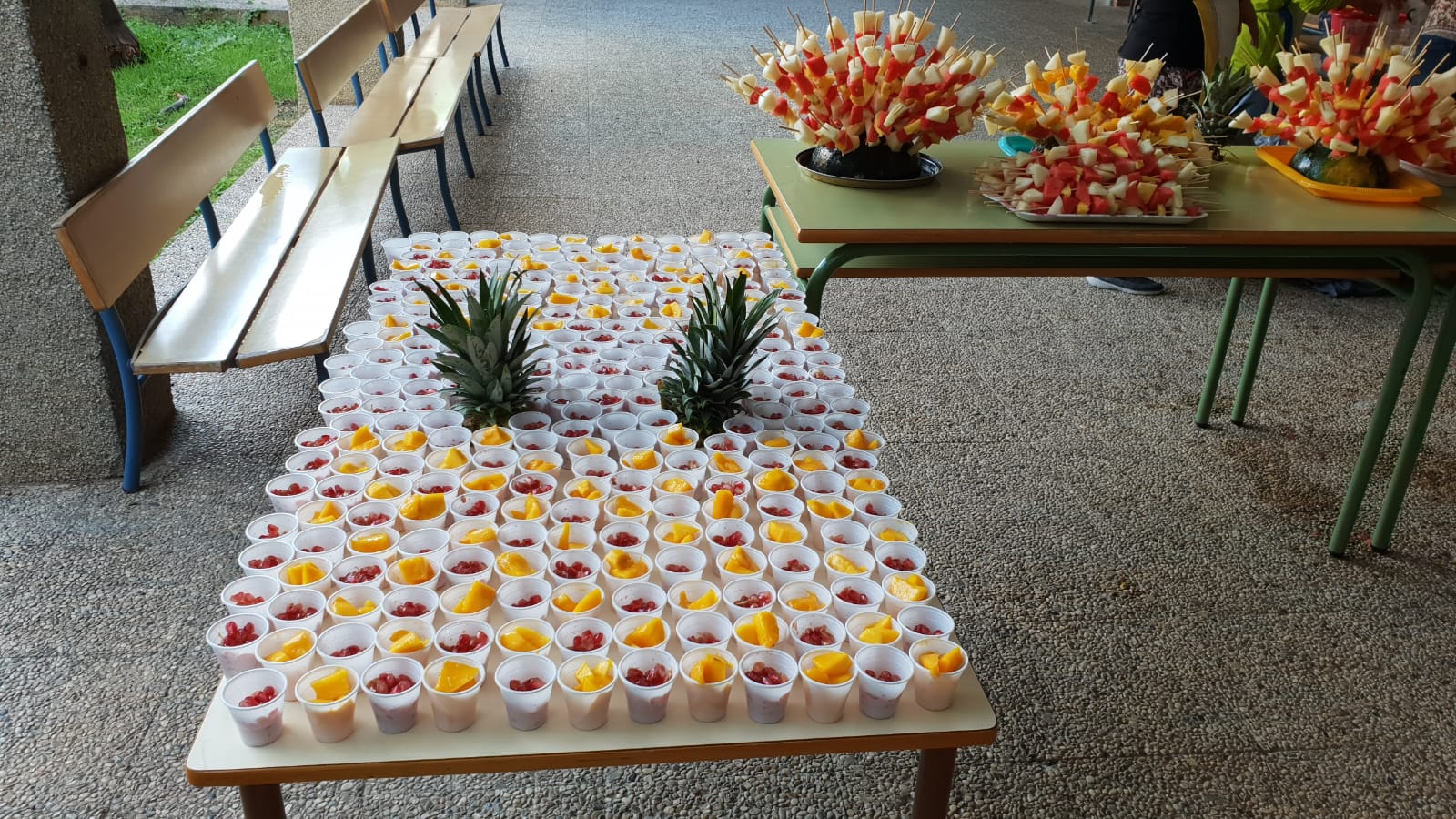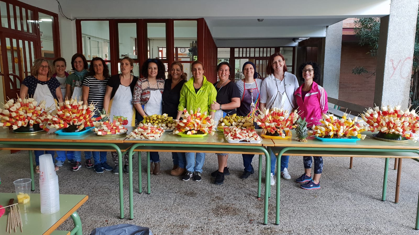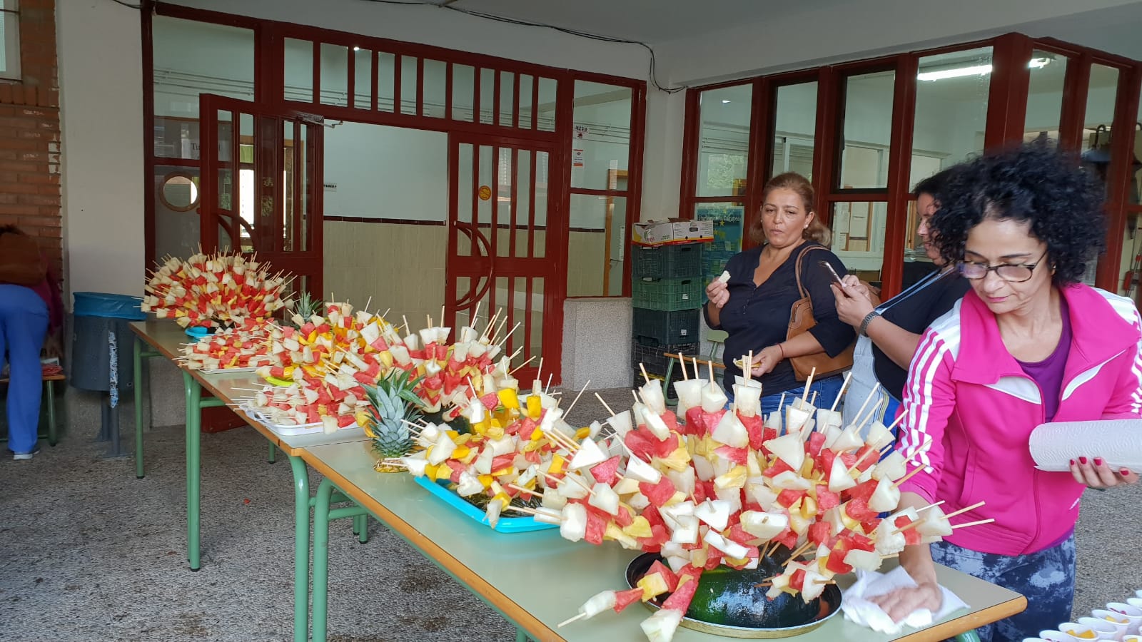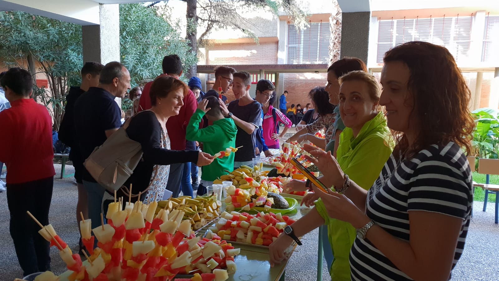 A la hora del recreo las madres de nuestra AMPA, el Acueducto, llenaron el patio de sabores y colores saludables ofreciendo para todos un desayuno de diferentes frutas montadas con diversas formas y composiciones muy imaginativas y atractivas que alegraron nuestra vista y nuestro paladar a la vez que combinaban una serie de vitaminas necesarias cada día.