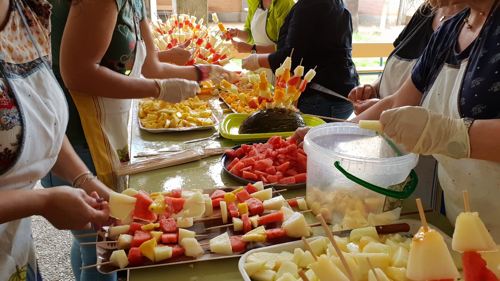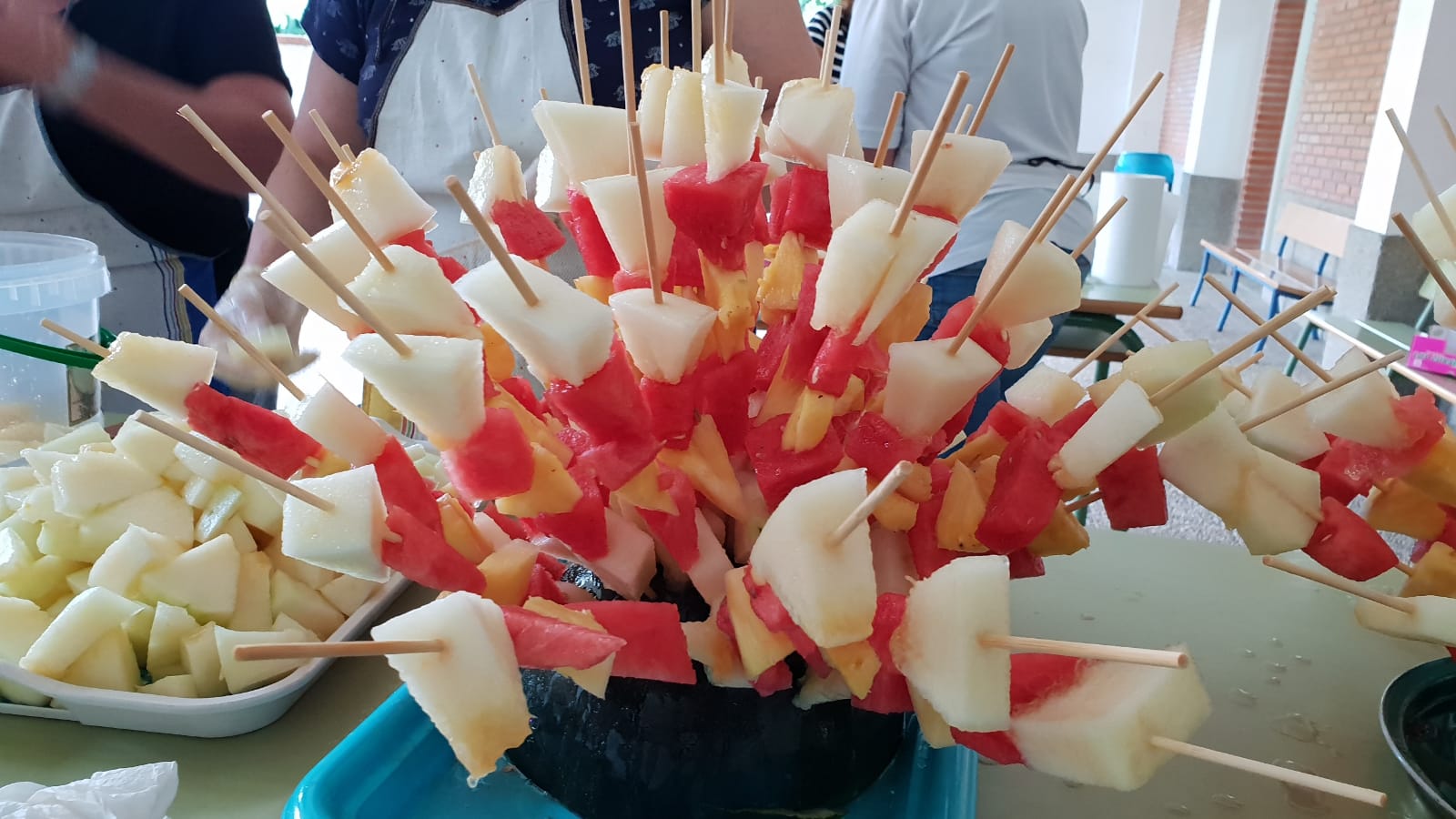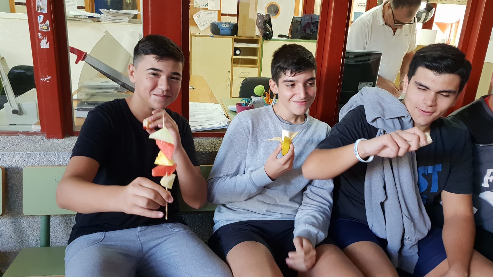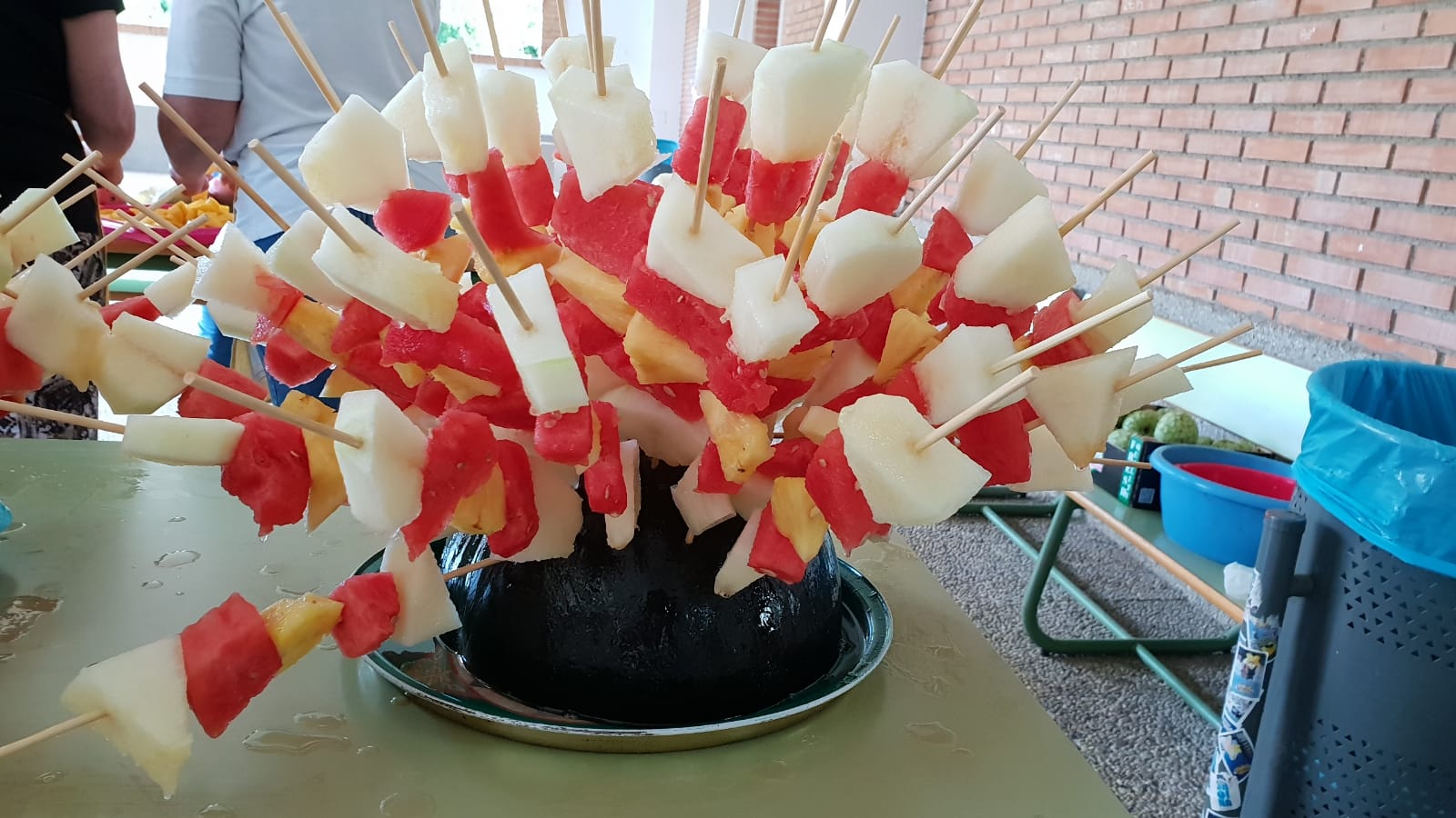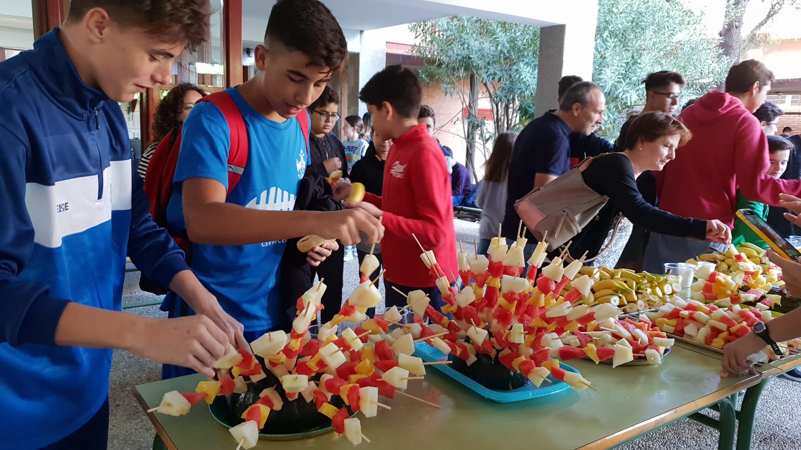 A la hora del recreo las madres de nuestra AMPA, el Acueducto, llenaron el patio de sabores y colores saludables ofreciendo para todos un desayuno de diferentes frutas montadas con diversas formas y composiciones muy imaginativas y atractivas que alegraron nuestra vista y nuestro paladar a la vez que combinaban una serie de vitaminas necesarias cada día.