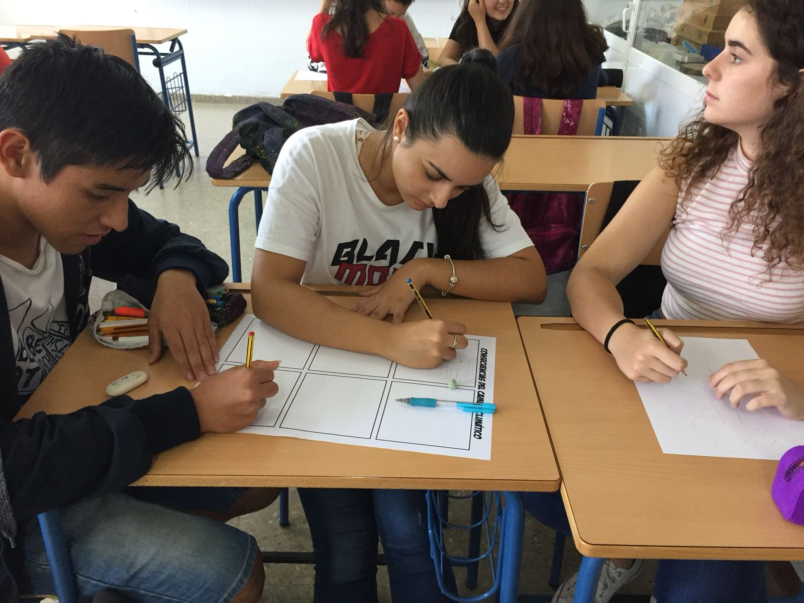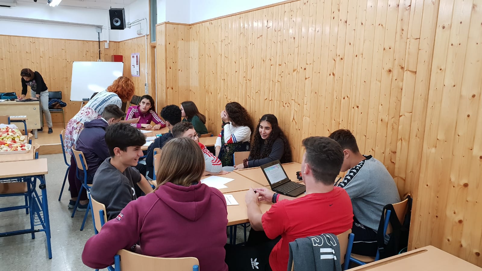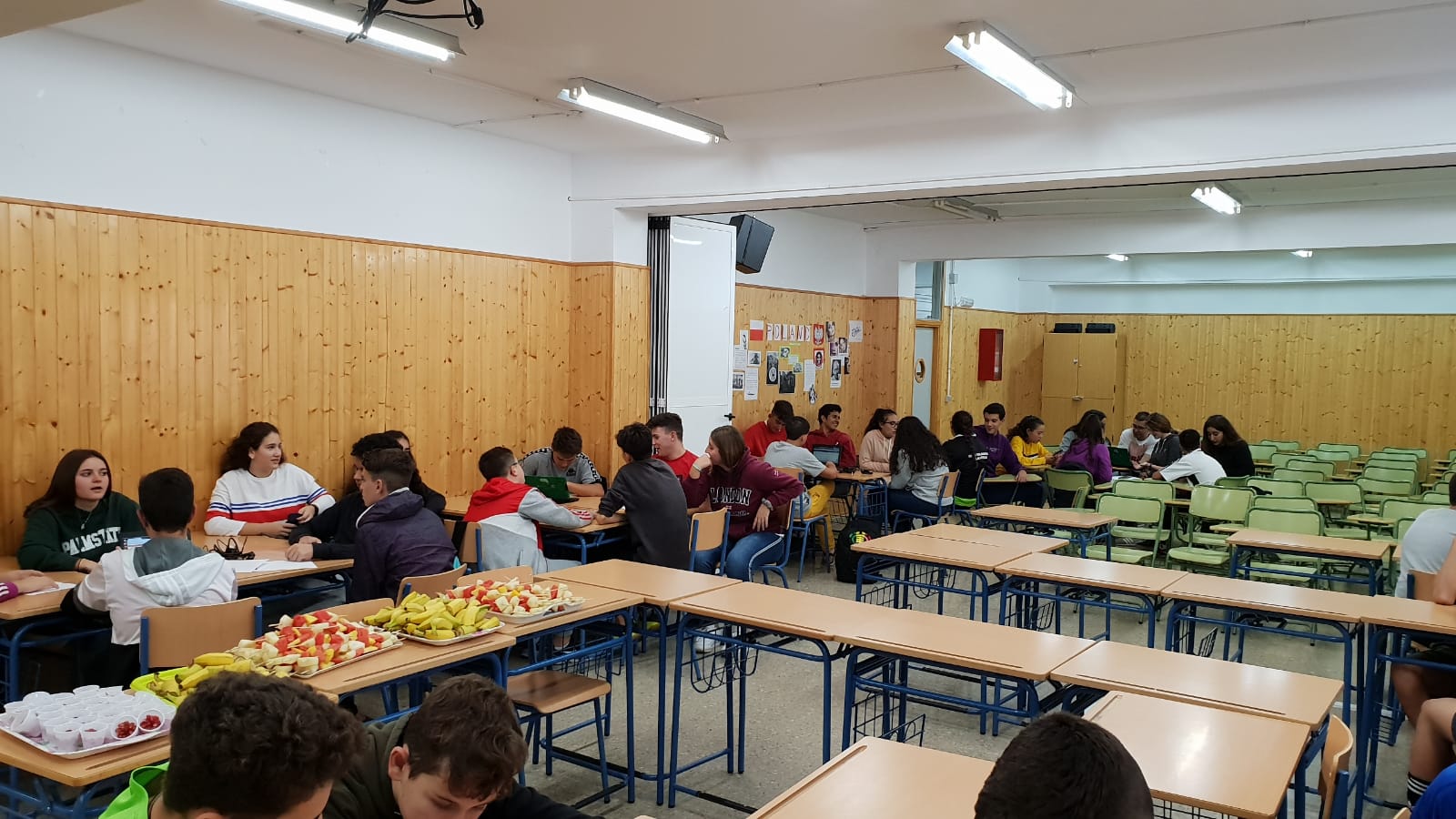 Después del recreo, los alumnos de 4º de E.S.O. asistieron a unos talleres impartidos por Virginia Montañés: “Solidaridad y Alimentación Saludable” desde el Programa de Bilingüismo y con motivo del desarrollo de una unidad integrada. El alumnado estuvo investigando sobre los diferentes problemas derivados de la alimentación y de la carencia de ella para terminar con la realización de un noticiario en inglés y en español en el que se resumía todo lo aprendido. Estuvo presente además M.ª Asunción Medina, la psicóloga de Asuntos Sociales, en las actuaciones del Programa Forma Joven.