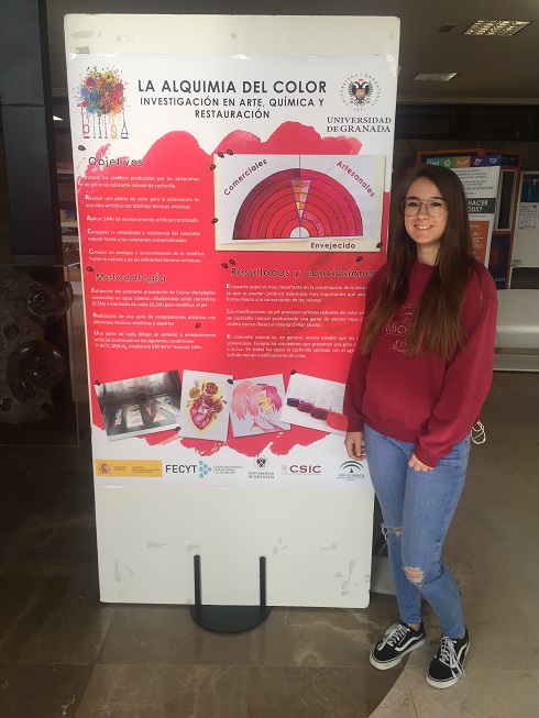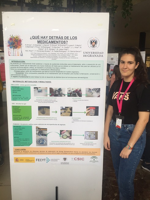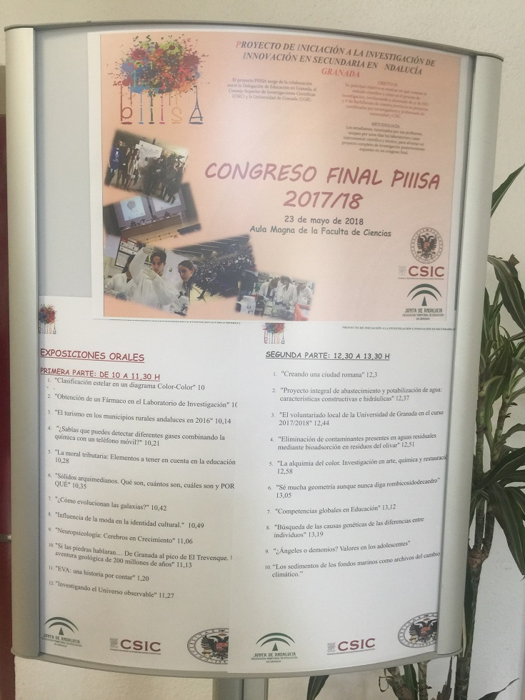 - Lidia Zamora López (4º ESO A): "La alquimia del color. Investigación en arte, química y restauración"El proyecto PIIISA ha estado coordinado por la orientadora del centro, Dª Inmaculada Fernández, como una medida de atención a la diversidad dirigida al alumnado especialmente motivado en el aprendizaje y con interés en profundizar en su tiempo libre en alguna de las áreas de su interés. Cada uno de esos proyectos se celebró durante al menos 4 sesiones en el curso en las sedes universitarias y de investigación que se determinaron para cada proyecto, como la Facultad de Farmacia, la Escuela de Estudios Árabes, el Instituto de Parasitología y Biotecnología López Neyra, la Facultad de Ciencias de la Educación, etc. Allí, profesores/as universitarios estuvieron desarrollando diferentes proyectos con el alumnado de los distintos centros de la provincia de Granada que se habían apuntado a cada uno de ellos. Como jornada de clausura, el pasado miércoles 23 de mayo en la Facultad de Ciencias de Granada, se celebró un Congreso Final donde se expusieron los proyectos, se mostraron los pósters científicos de trabajo que se habían realizado, para dar a conocer los objetivos propuestos, los procedimientos utilizados y los resultados obtenidos a la comunidad educativa y científica. Se adjuntan las fotografías realizadas en esa jornada con nuestro alumnado participante, junto con el póster de su proyecto.