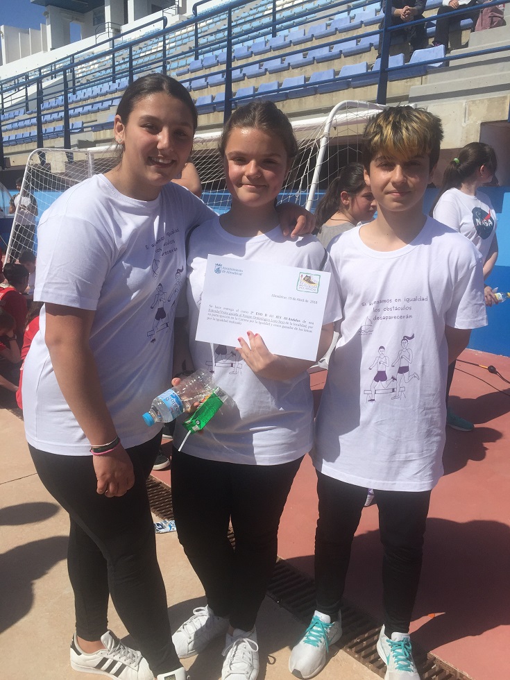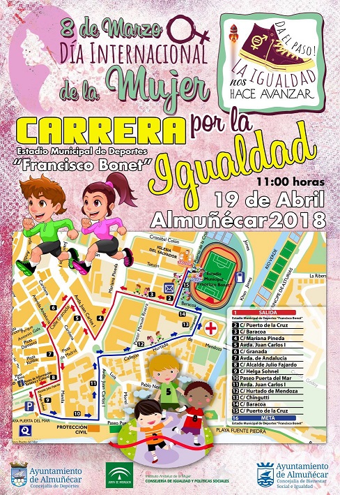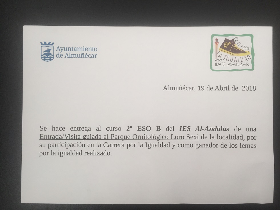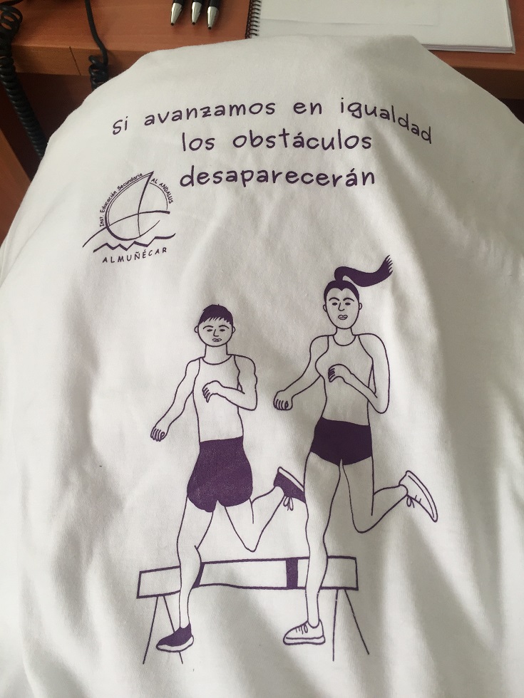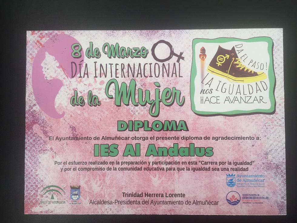 Para conmemorar el Día Internacional de la Mujer, el Ayuntamiento de Almuñécar ha organizado la "Carrera por la Igualdad", con el lema "Da el paso: la Igualdad nos hace avanzar". El IES Al-Ándalus, comprometido con el trabajo educativo para que los chicos y chicas tengan los mismos derechos, decidió participar, siendo elegidos los cursos de 2º ESO A y B para representar al centro educativo. Así, la tutora de 2º ESO A (Dª Elizabeth Ortega) y el tutor de 2º ESO B (Dº José Emilio García), coordinados por la encargada del Plan de Igualdad del centro, Dª Inmaculada Fernández, trabajaron con los alumnos/as de su grupo qué lema representaría a su clase relacionado con esta temática. Se propusieron distintas alternativas y resultaron seleccionadas las siguientes: