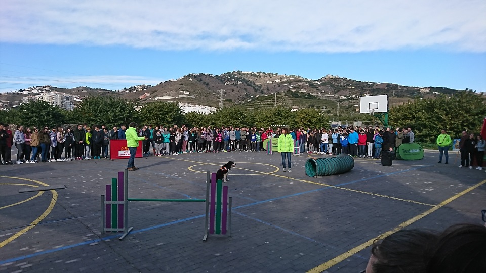 Hoy lunes 5 de Febrero, nuestro alumnado de 4º de la ESO, 1º de Bachillerato y FP han podido disfrutar en las pistas deportivas de una espectacular Exhibición Canina dentro de un programa promovido por la Consejería de Educación y Tiendanimal Educa para la concienciación con la naturaleza y el respeto hacia los animales. En esta exhibición hemos podido contemplar al mejor amigo del hombre realizar saltos y piruetas asombrosas y ver a diferentes razas trabajando para los diferentes trabajos para los cuales fueron concebidas como la defensa o el rastreo. Como bien nos dejaron claro los adiestradores la mejor forma para conseguir objetivos con un perro es mediante el refuerzo positivo y las recompensas. Al final de la actividad los alumnos tuvieron ocasión de acariciar a los protagonistas del show.