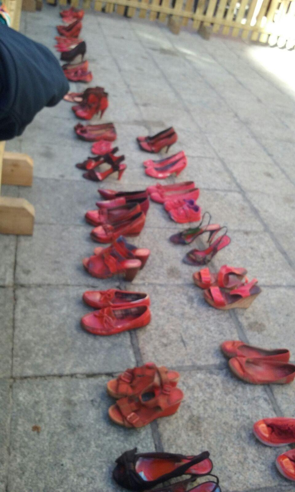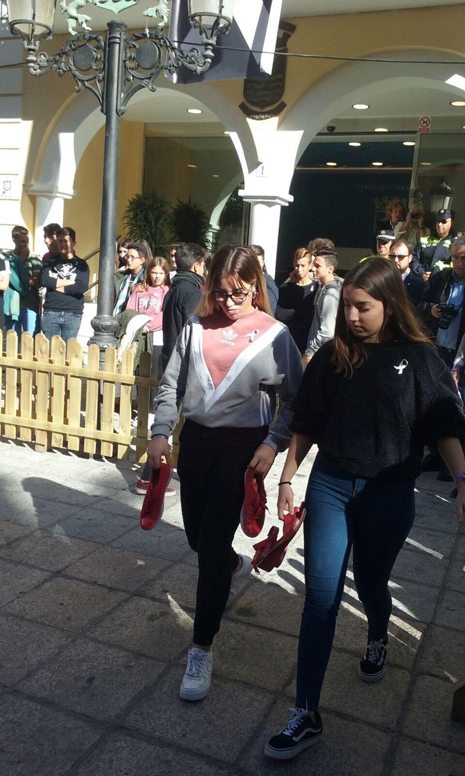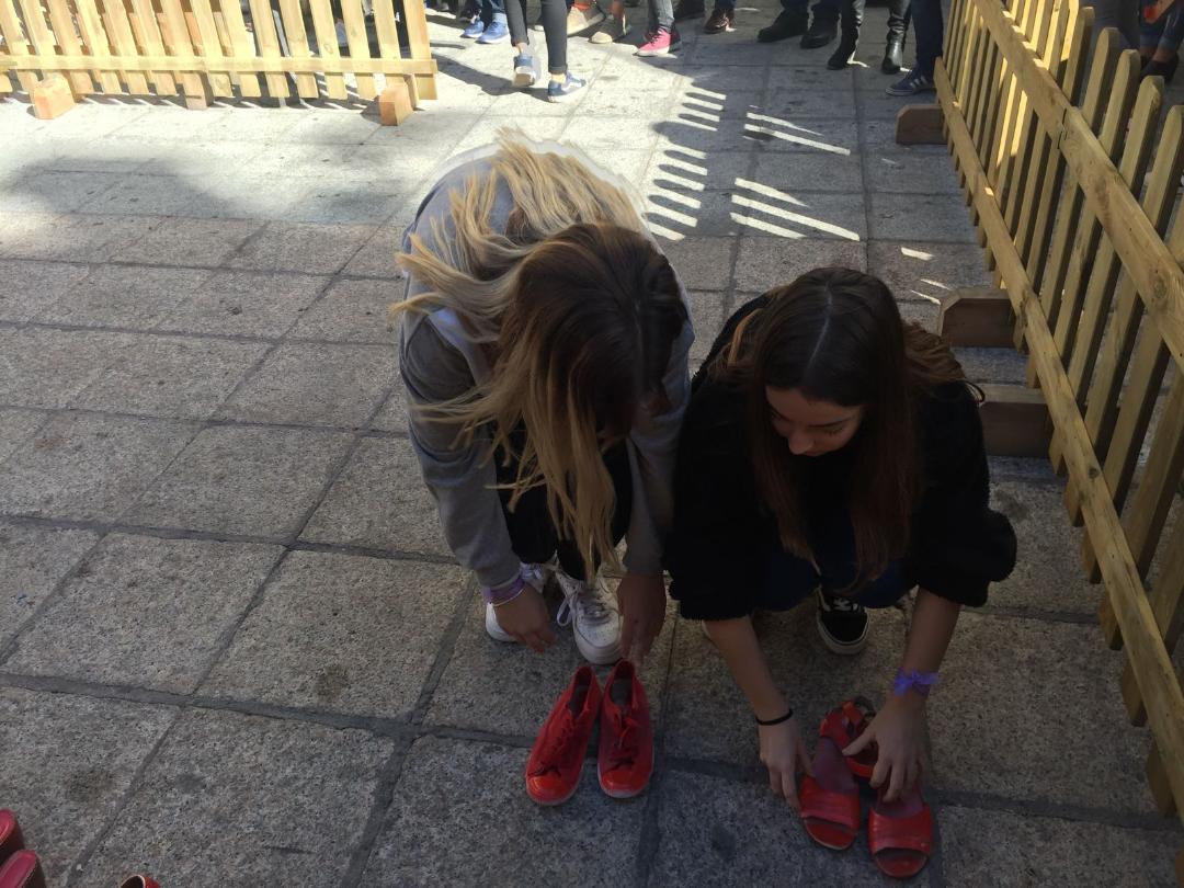 El acto se tiñó de una gran emotividad: la alcaldesa pronunció unas palabras y jóvenes de nuestro instituto y de otros que también participaron, depositaron zapatos “ensangrentados” en el suelo como símbolo de cada una de las víctimas. Las alumnas de 4º Roberta Branco,Lidia Zamora López, Celia Gómez y Olalla Hillbrecht leyeron los microrrelatos (PINCHA EN EL NOMBRE DE CADA ALUMNA PARA VER SU MICRORRELATO) que habían presentado al concurso Mónica Carrión.