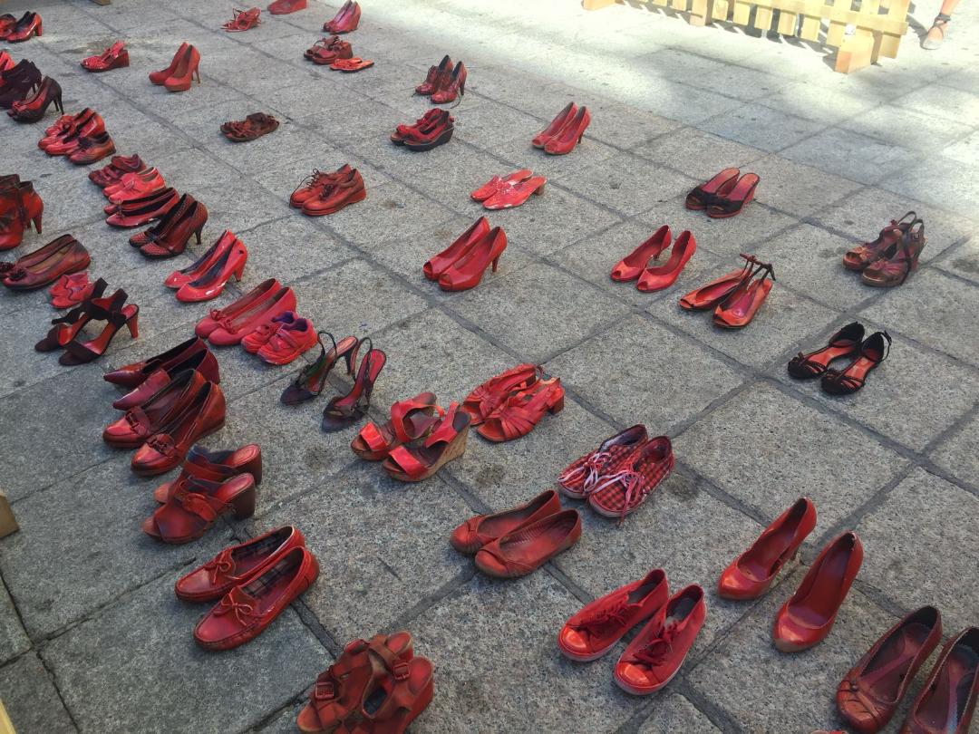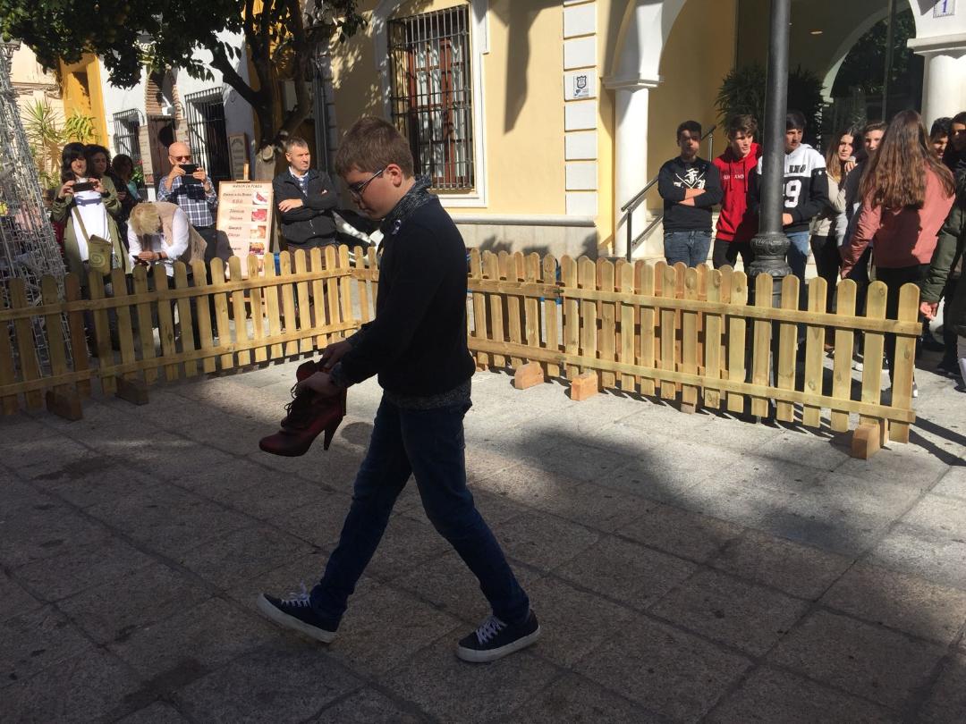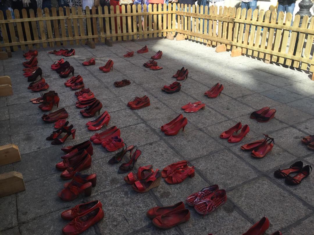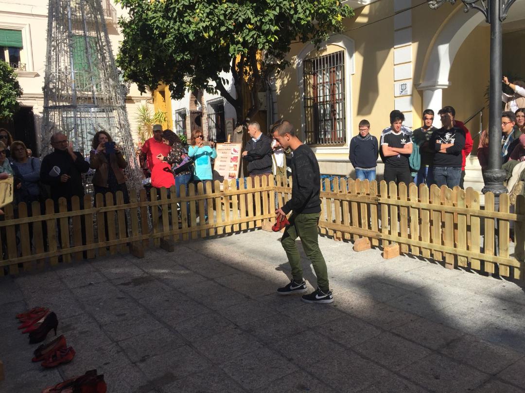 El acto se tiñó de una gran emotividad: la alcaldesa pronunció unas palabras y jóvenes de nuestro instituto y de otros que también participaron, depositaron zapatos “ensangrentados” en el suelo como símbolo de cada una de las víctimas. Las alumnas de 4º Roberta Branco,Lidia Zamora López, Celia Gómez y Olalla Hillbrecht leyeron los microrrelatos (PINCHA EN EL NOMBRE DE CADA ALUMNA PARA VER SU MICRORRELATO) que habían presentado al concurso Mónica Carrión.