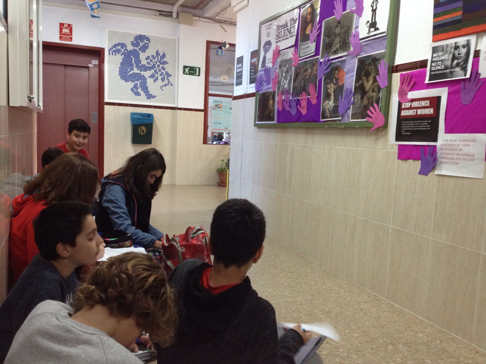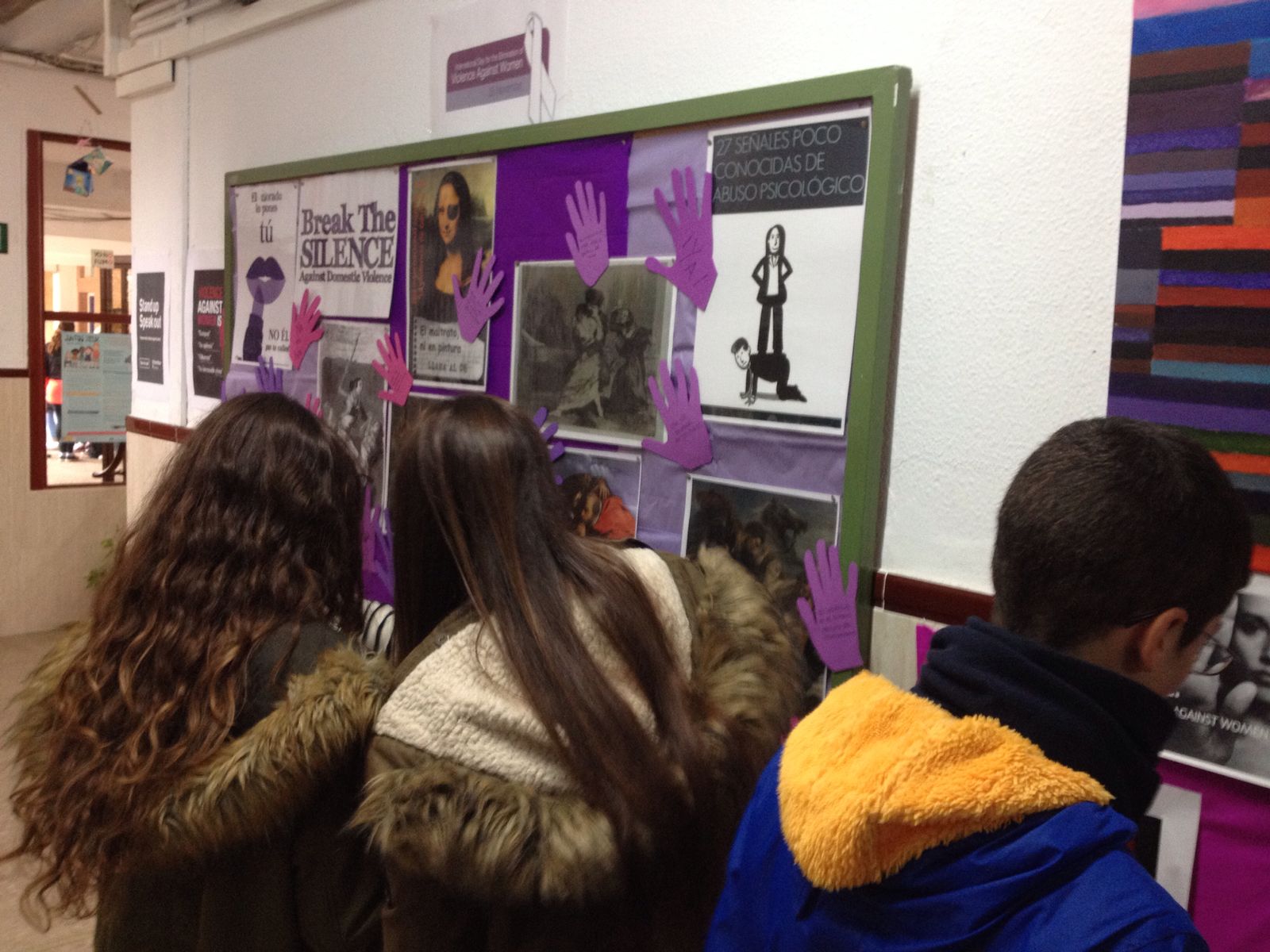 En Bilingüismo se han realizado carteles y lemas en inglés y español alusivos al maltrato, la violencia y la necesidad de concienciación y cambio. También han realizado una exposición en colaboración con el Departamento de Ciencias Sociales, “El Maltrato ni en Pintura” en la que han participado diversos grupos de alumnos en su visualización detallada y realización posterior de unos cuestionarios.