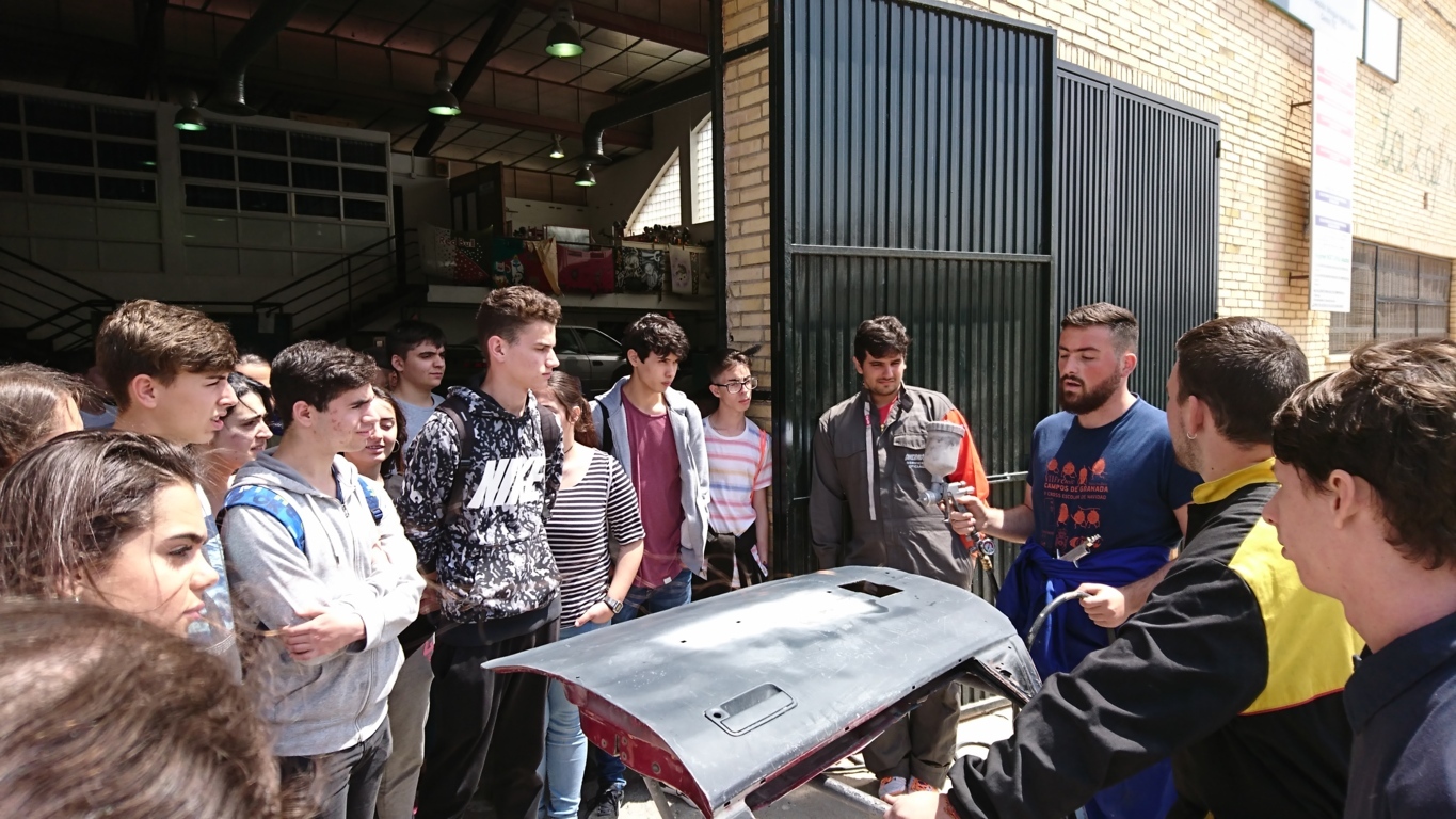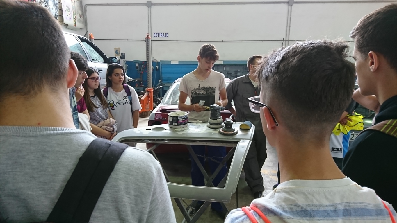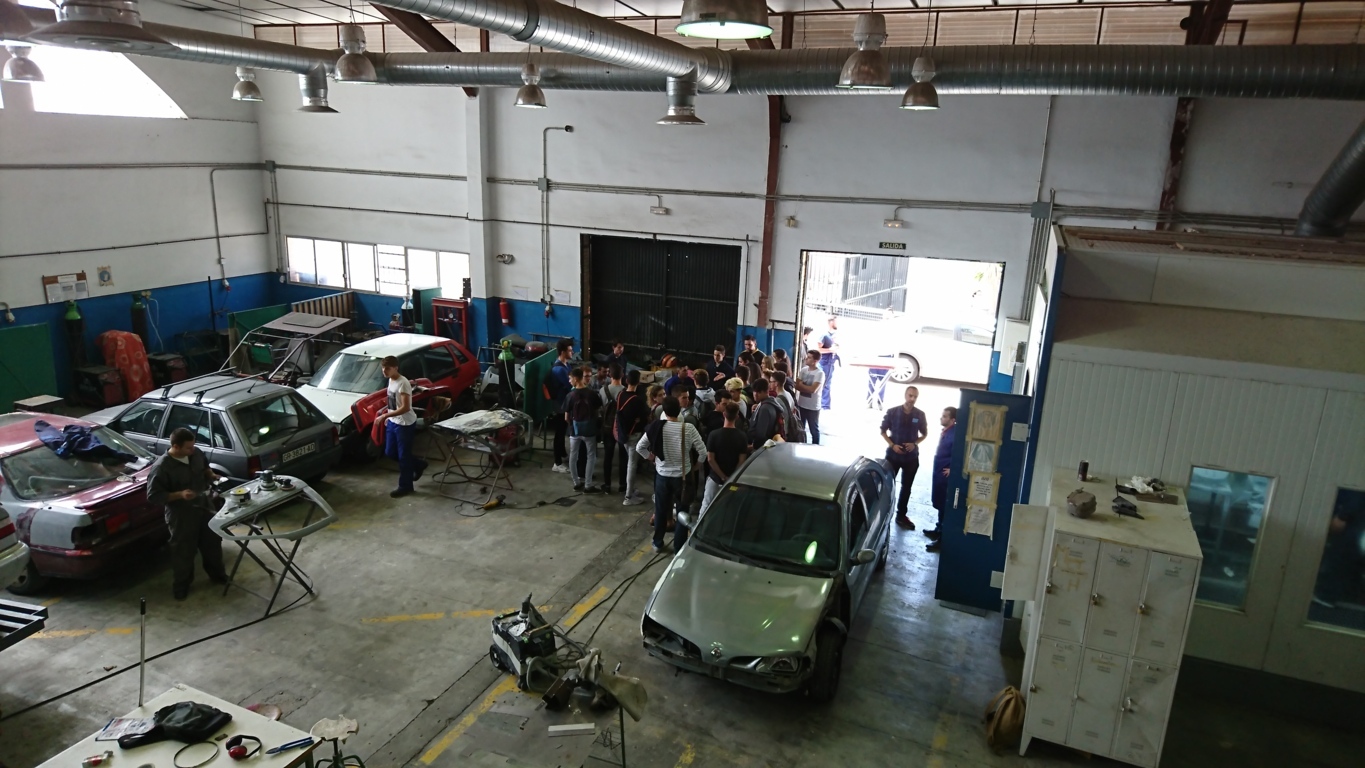 La última de las paradas fue a las naves de talleres donde se imparten los ciclos de Instalaciones de Telecomunicaciones donde nos mostraron demostraciones de alarmas de robo y la visita a la zona de taller mecánico donde se imparten los ciclos formativos de Electromecánica de vehículos en el cual pudimos ver a los alumnos reparando motores o embragues y el ciclo de Carrocería en el que nuestros alumnos pudieron ver e incluso practicar reparaciones y pintado de chapa:
