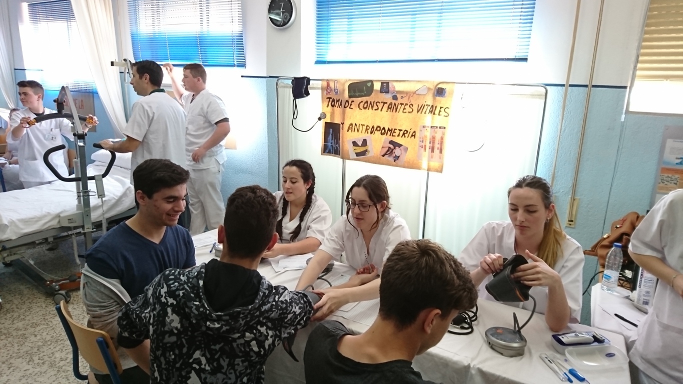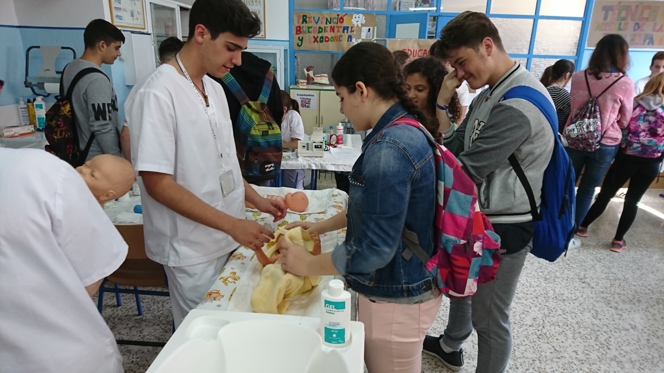 El Ciclo Formativo de Grado Medio de Cuidados Auxiliares de Enfermería, en los stands de este ciclo nuestros alumnos pudieron medir su tensión, realizar prácticas de cuidado de recién nacidos, de movimiento de enfermos o ver los efectos que tiene el tabaco en los pulmones de un fumador.