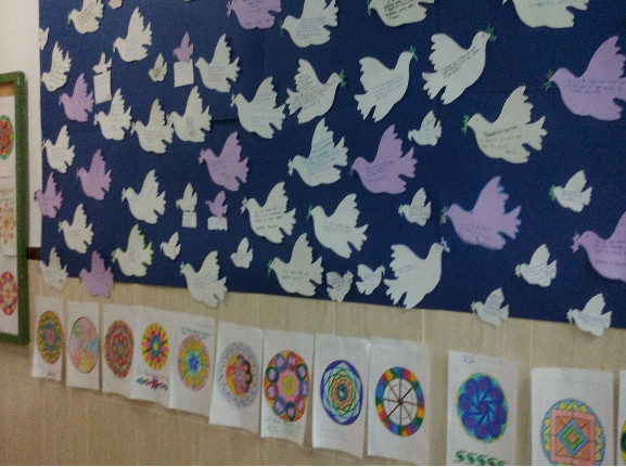| 1.-Mural con Palomas de la Paz y Mandalas, hechos por nuestro alumnado |